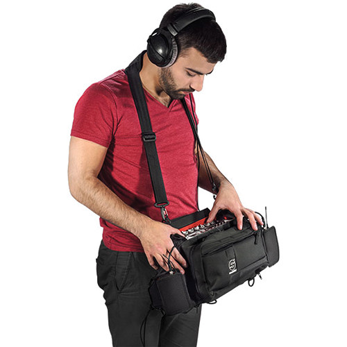 A double floor makes it easier to organize headphone cables. An internal pocket can house the mixer's battery and exterior straps allow you to carry a boom pole and extra cables with ease. The system can be expanded by using snap-on pouches for transmitters or receivers. An exterior front accessories pocket features a detachable frame that holds up to six wireless receivers and transmitters. For comfort while working, the bag features padded adjustable shoulder straps.