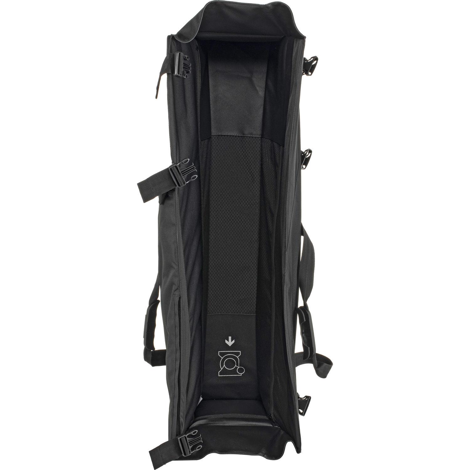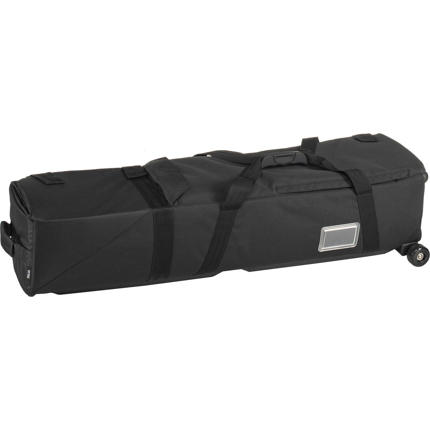 Store, protect, and transport your tripod and accessories in the black padded Roll-Along Tripod Cage in large from Sachtler. This case is designed to hold a 41.7" tripod. It has a large zippered accessory pocket on top, dual top handles with a connector in the middle of the case, a flap closure on three sides for easy access, and three adjustable straps with quick release buckles. The top of the case has a useful haul handle which functions in combination with the two wheels on the bottom, for rolling over level ground. The bottom wheels are spaced wide apart for enhanced stability. The bottom end opposite the wheels has two feet for enhanced stability. Made of polyester and nylon, your Roll-Along Tripod Case is both durable and strong.