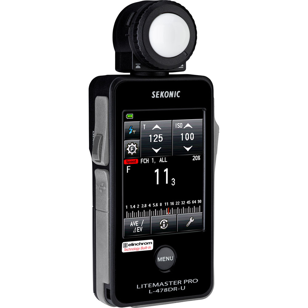 Equipped with a large and intuitive 2.7" color touchscreen LCD and now featuring built-in radio flash power control and triggering for the 2.4 GHz Elinchrom EL Skyport wireless system, the LiteMaster Pro L-478DR-U-EL Series Light Meter from Sekonic will make incident metering for ambient and flash light super simple. The major ability of this system enables complete control of the flash's power in 0.1-step increments. Along with this, the 20-channel system has separate selection between 4 groups with measured values maintained for ratio determination. Users will also be able to control modeling lamp power as well as set ALL groups at once.