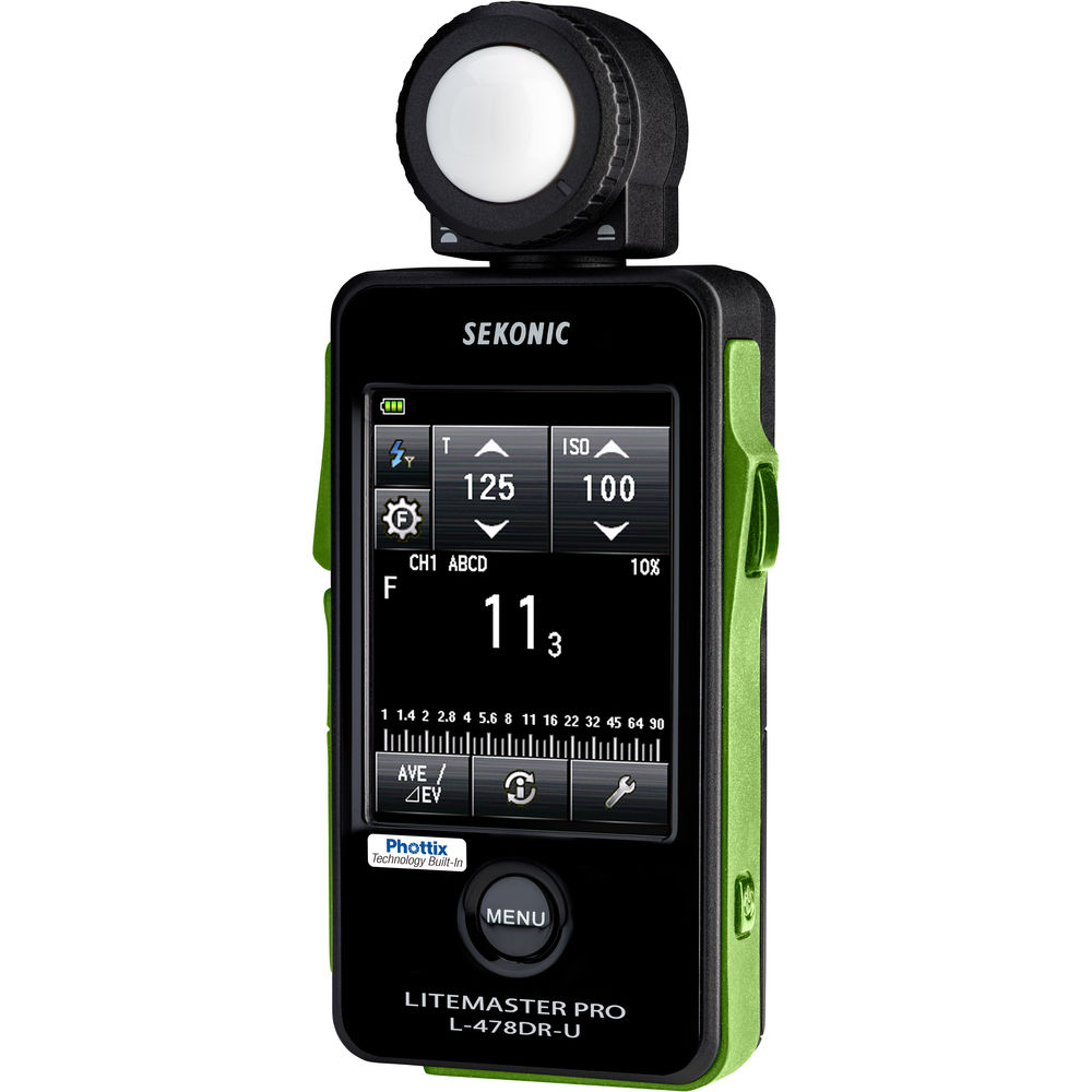 Equipped with a large and intuitive 2.7" color touchscreen LCD and now featuring built-in radio triggering for the 2.4 GHz Phottix Strato II wireless system, the LiteMaster Pro L-478DR-U-PX Series Light Meter from Sekonic will make incident metering for ambient and flash light super simple. The 4-channel system also has separate selection between 4 groups with measured values maintained for ratio determination.