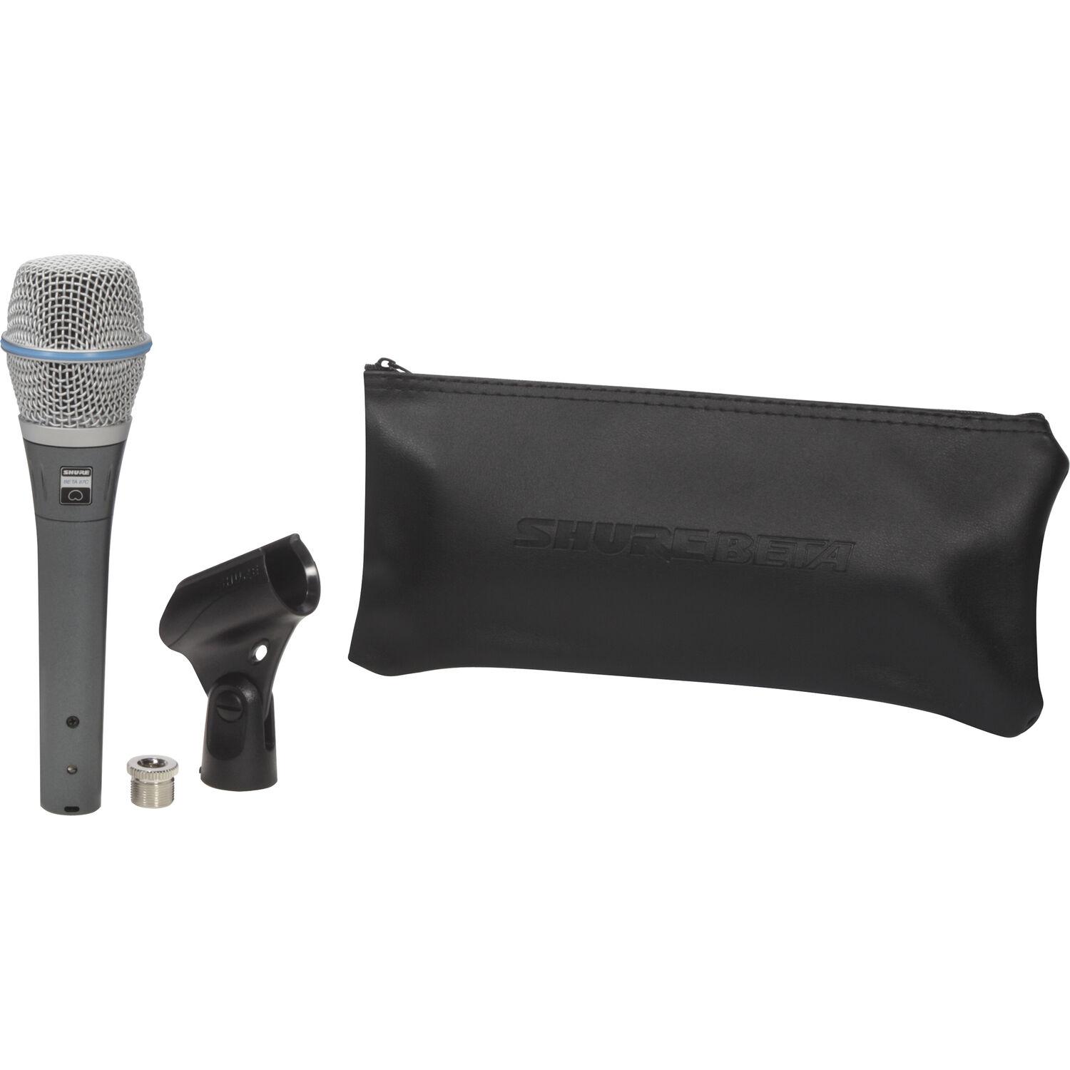 With an internal shockmount inside the mic cartridge, the Beta 87A minimizes mechanical shock, avoiding handling noise and sounds caused by accidental bumps. An integrated pop filter reduces plosives like Ps and Ts without any extra accessories, allowing vocalists to remain in view on stage. The Beta 87A offers a wide dynamic range of 117 dB with low distortion characteristics. This microphone features a dent-resistant steel mesh grille and the body is constructed from enamel-coated metal alloy to reduce wear and abuse for years of rigorous touring or studio use. The Beta 87A includes a swivel mic stand adapter and a zippered carrying bag.