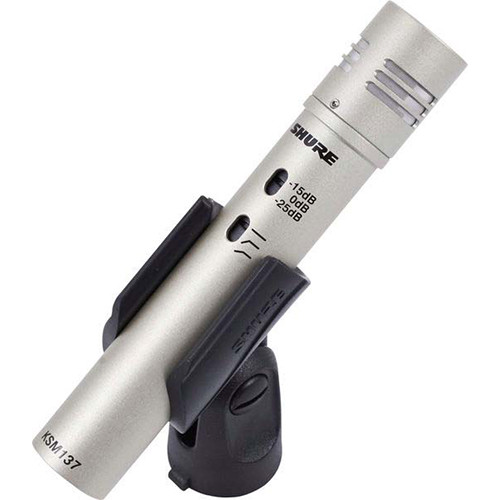 The KSM137/SL from Shure is a cardioid condenser studio microphone designed for instrument recording and sound reinforcement. The KSM137/SL offers a wide 20 Hz to 20 kHz frequency response making it a flexible microphone for a variety of applications. The KSM137/SL features a cardioid element and permanently biased transducer design resulting in clean, accurate signal reproduction and frequency response. The transformer-less, class-A output circuitry provides a noise free output signal path while maintaining high gain levels. The tight cardioid pattern is effective in attenuating off-axis signal due to room ambiance, instruments, monitor noise etc.
