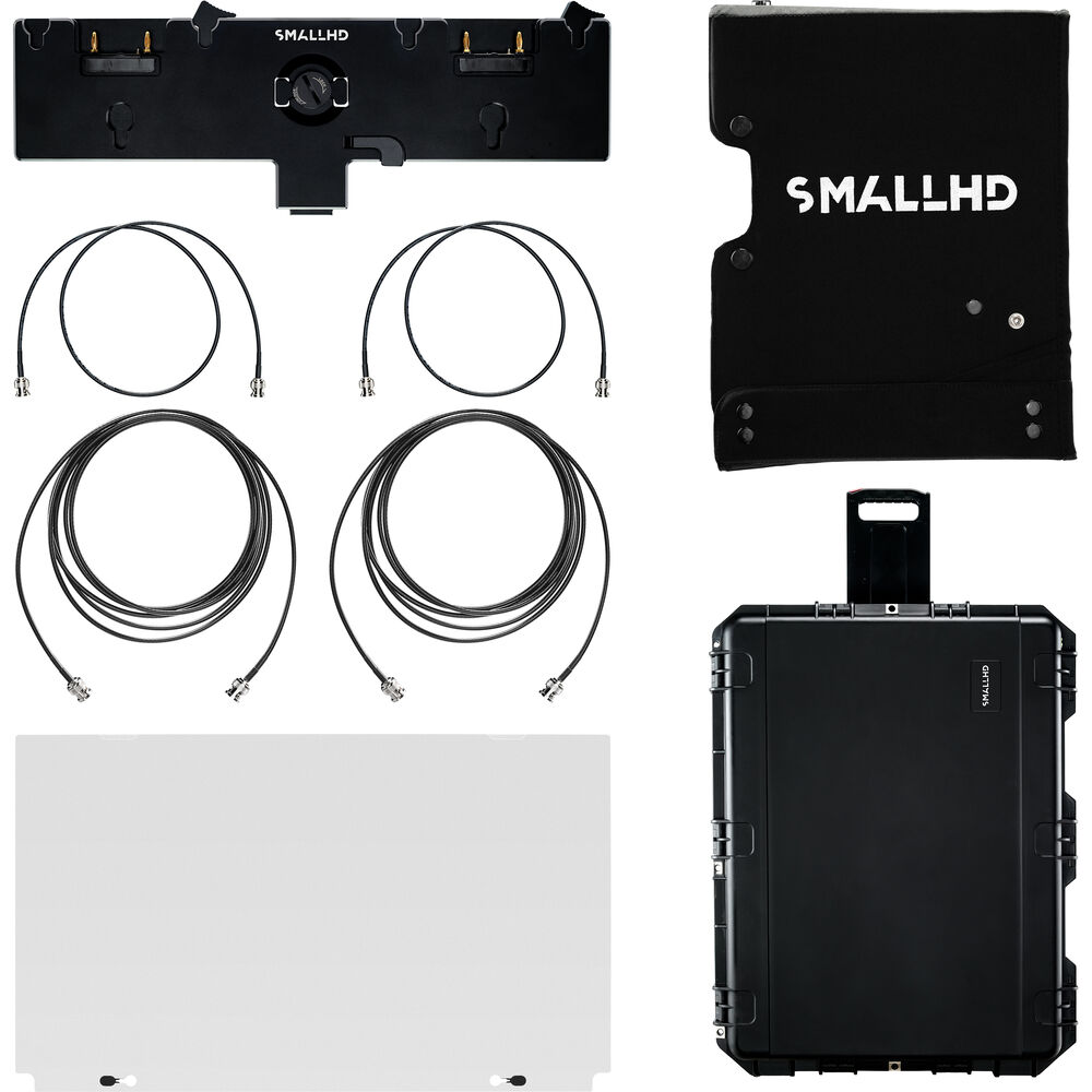 The battery bracket mounts on the back of the monitor, providing two Gold mount battery plates that support 14 and 26V batteries to allow hot swapping when using the monitor's 3-pin XLR power input. The screen protector locks onto the front of the monitor and protects it from scratches and dust. The fabric sun hood mounts onto the cheese sticks that come with the monitor, and it can be adjusted to use three or four of the sides to block light and glare from the display. The two included 12G-SDI cables measure 36" and 120" in length. The carry case features a custom cut foam insert to store, protect, and transport the monitor and all of its accessories.