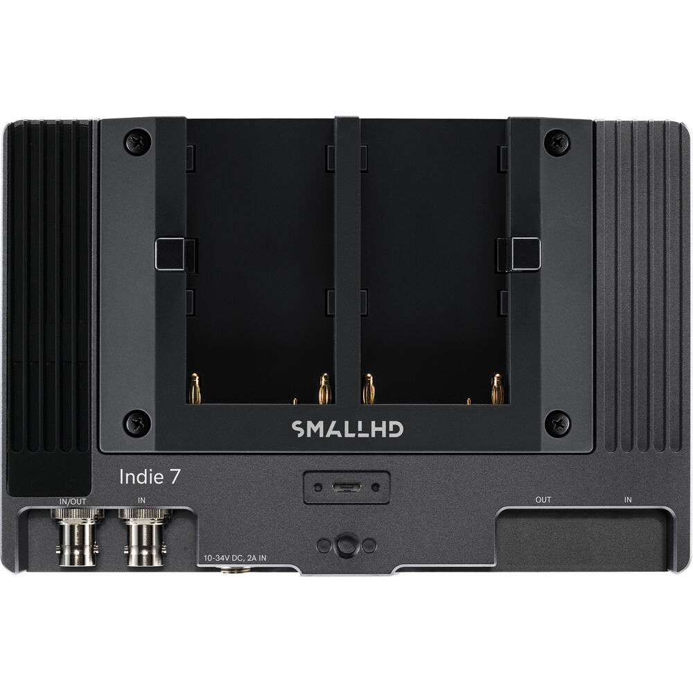 The INDIE 7 is powered using the included L-series battery plate or using the 2mm barrel input with a DC adapter. It can also be powered using separately available Gold mount or V-mount battery plates. An SD card slot allows you to import custom 3D LUTs and a micro-USB port to provide upgrades to the display. Four 1/4"-20 threads allow you to mount the monitor in a variety of configurations. The 3.5mm headphone jack allows you to monitor the embedded audio from the HDMI or 3G-SDI inputs.