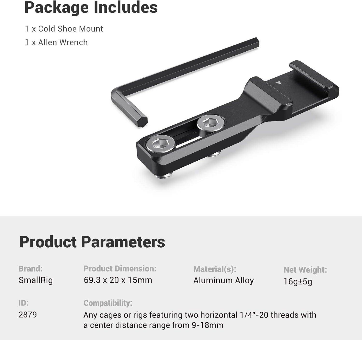 SmallRig Cold Shoe Extension 2879 is designed to hold accessories on the side of your rig when using cameras. The cold shoe mount maintains access to camera buttons after mounting a microphone or light. It secures to cages and plates with two captive 1/4”-20 screws to prevent it from losing. The cold shoe features a stopper edge in one end to prevent your accessory from suddenly sliding out.