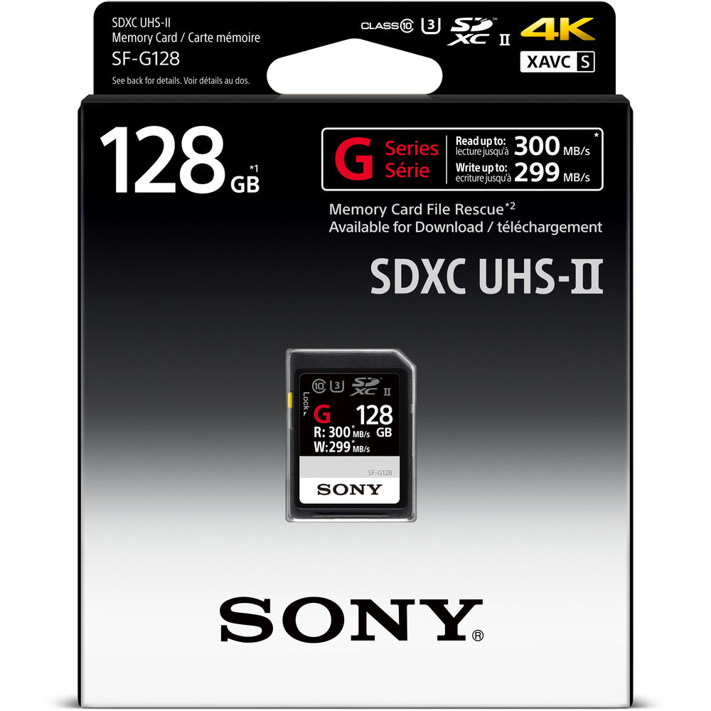 The 128GB SF-G Series UHS-II SDXC Memory Card from Sony features a storage capacity of 128GB and takes advantage of the UHS-II bus to support advanced DSLR functions such as continuous shutter bursts and rapid shooting, as well as RAW and JPEG captures. This card is also well-suited for video capture, including 4K, 3D, HFR, and Full HD video, and can achieve maximum read speeds of up to 300 MB/s and maximum write speeds of up to 299 MB/s. Thanks to its U3 speed class rating, minimum write speeds are guaranteed not to drop below 30 MB/s.