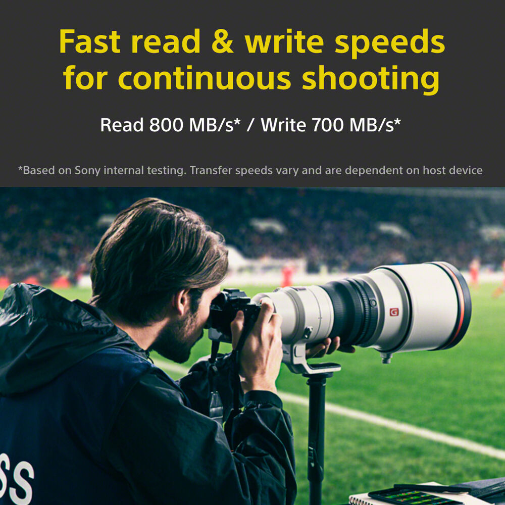 Offering both strength and speed, the 320GB CFexpress Type A TOUGH Memory Card from Sony provides fast read speeds up to 800 MB/s along with write speeds up to 700 MB/s. This quick performance benefits recording a variety of video resolutions, bit-rates, and compressions, as well as high-resolution continuous raw photo shooting. Beyond its speed, this TOUGH memory card also has a reinforced physical design to withstand falls from up to 15' and has been rigidity tested to 70 N of force. It's also resistant to extreme temperatures, X-rays, electrostatic, and UV lighting. Offering further protection, File Rescue recovery software can be downloaded for recovering lost or even accidentally deleted files and Media Scan Utility can be used to automatically scan CFexpress cards and inform you of the flash memory condition.
