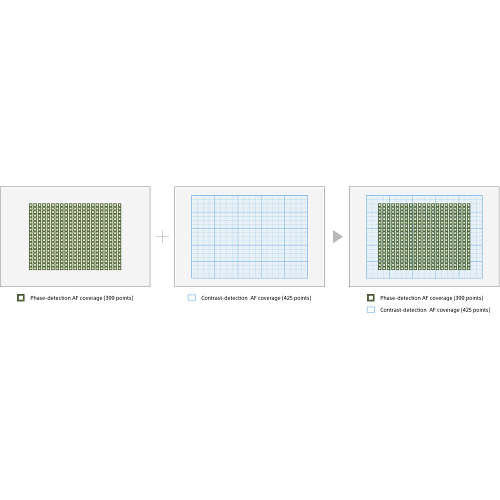 An evolved 4D FOCUS system now employs a combination of 399 phase-detection points, which cover approximately 68% of the frame, along with 425 contrast-detection areas for reliable and quick autofocus and subject tracking performance. This Fast Hybrid AF System now achieves twice the focusing speed and more reliable tracking compared to previous a7R models, as well as improved low-light focusing response down to -3 EV.
