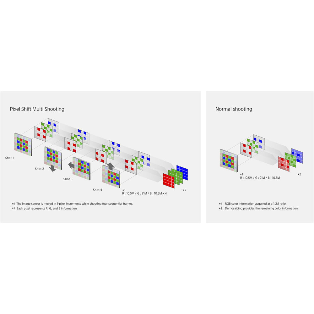 This unique compositing mode allows you to achieve even greater resolution than the 42.4MP sensor affords. Working in conjunction with the sensor-shift image stabilization, this mode shifts the sensor while making four consecutive exposures in order to acquire approximately 169.6MP of information for greater color accuracy and detail than possible with a single exposure. These files can then be merged together during post-production by using the Sony Imaging software suite.