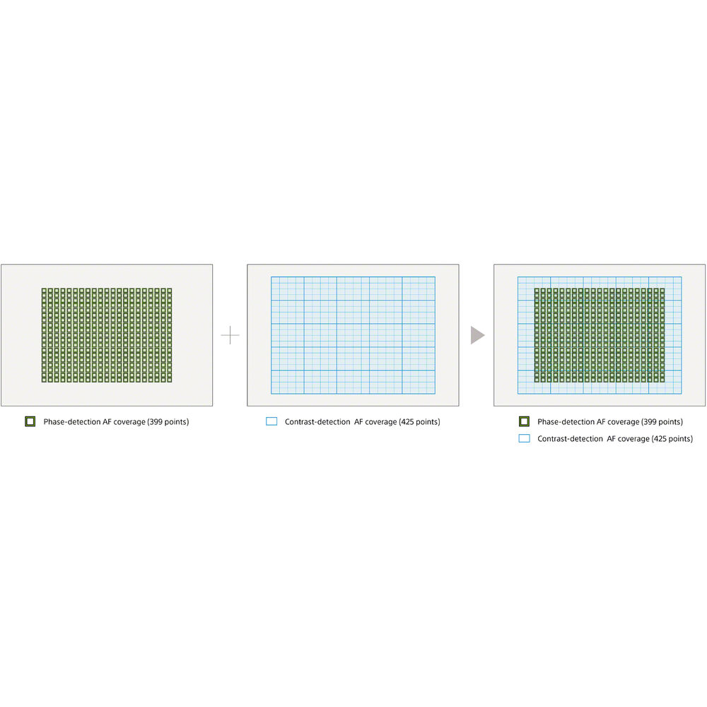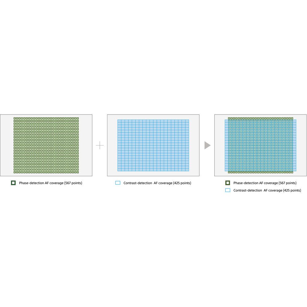 An updated Fast Hybrid AF system now employs a combination of 567 phase-detection points, which cover approximately 99.7% of the height and 74% of the width of the frame, along with 425 contrast-detection areas for reliable and quick autofocus and subject tracking performance. This focusing system also achieves especially quick speed and reliable tracking, as well as enhanced low-light focusing response down to -3 EV.