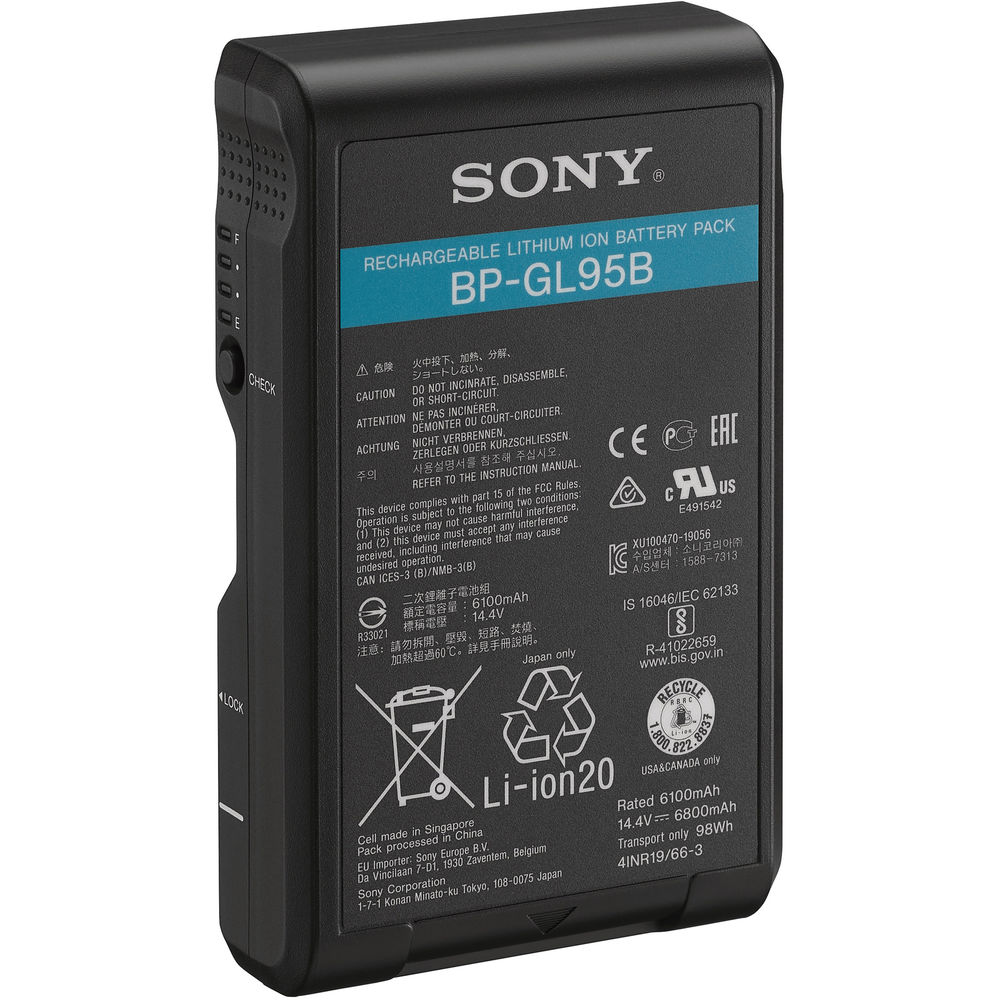 The BP-GL95B Lithium-Ion Battery from Sony powers professional camcorders, monitors, VTRs, and accessories that accept V-mount batteries. This lithium-ion battery has a power capacity of 98Wh, a nominal voltage of 14.4 VDC, 16.8 VDC maximum voltage, and maximum discharge of 10A. Read more below about compatible charger and camera models.