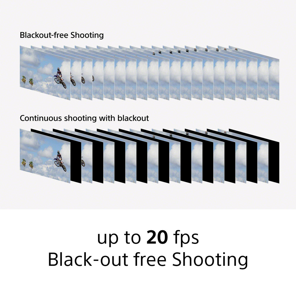 This sensor is paired with a revised BIONZ X image processor and front-end LSI, which dramatically improve the speed and throughput of the entire imaging system, enabling blackout-free continuous shooting at up to 20 fps with continuous AF/AE calculations being performed at 60 times per second. The Single Burst Shooting function also permits recording up to seven frames, in raw or JPEG, at 90 fps, 60 fps, or 30 fps for capturing the fastest of moments. The front-end LSI and enhanced sensor performance also improve overall image quality, especially at higher sensitivities, by reducing noise and offering higher perceived resolution and color definition.