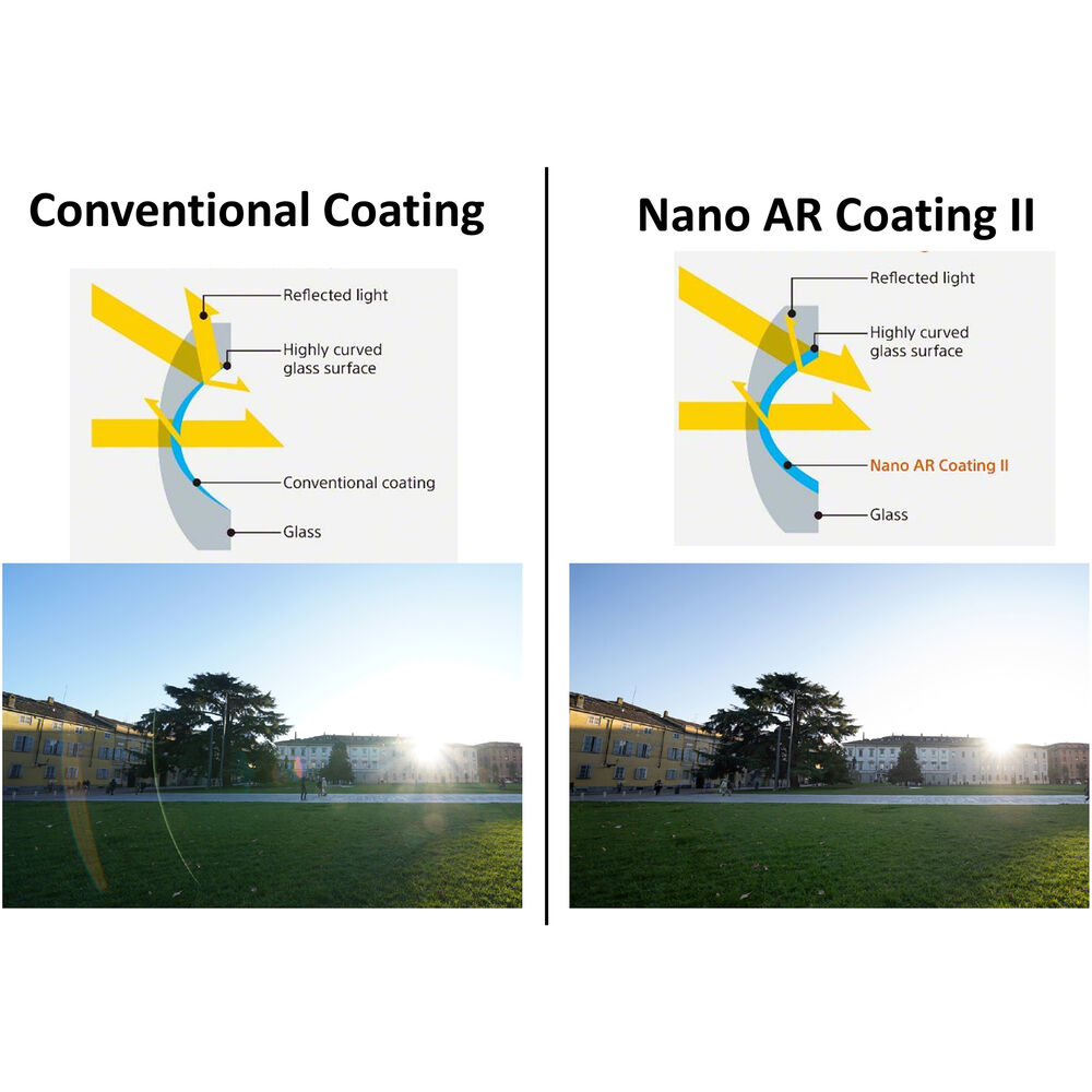 - Nano AR Coating II has been applied to reduce surface reflections, flare, and ghosting for increased contrast and color rendering in strong lighting conditions. This updated coating is better suited for larger, curved elements and is especially adept at minimizing internal reflections.