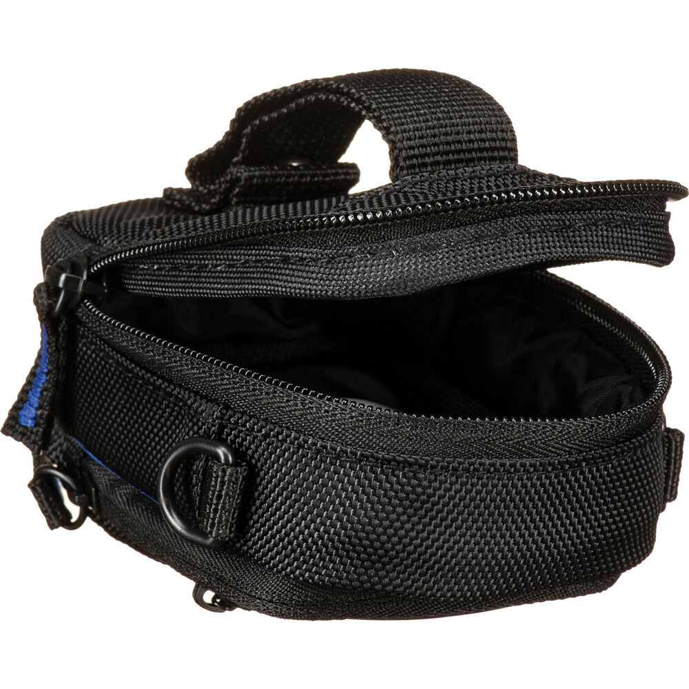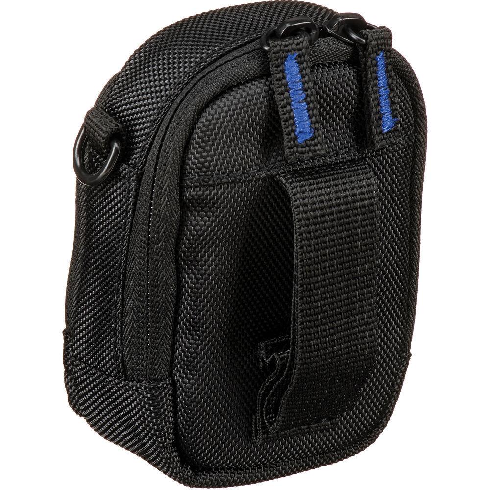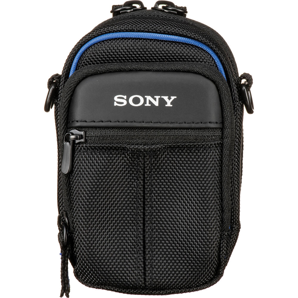 The Sony LCS-CSJ Soft Carrying Case is a black nylon bag made to protect a Sony DSC-S, DSC-W, DSC-T, or DSC-N series camera from bumps and scratches. It can store extra memory cards and small accessories in the exterior pouch. The case has a detachable shoulder strap and can be carried on the waist.