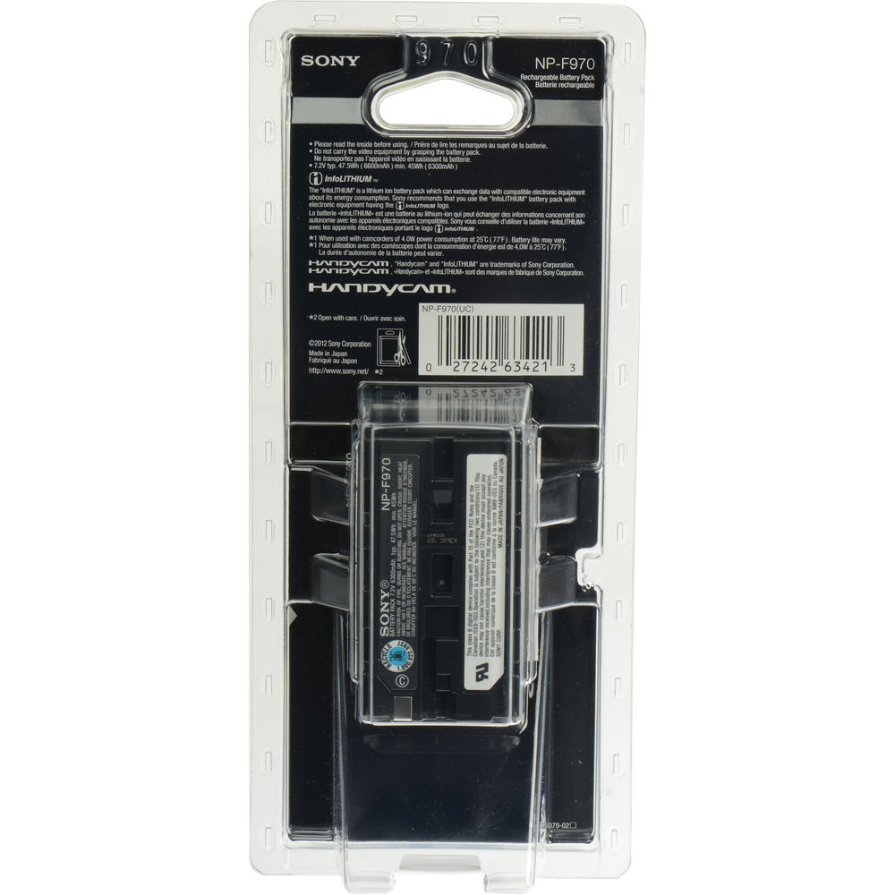 Small and lightweight, Sony's NP-F970 Info-Lithium Battery Pack (6300mAh) provides the advantages of lithium-ion, meaning it can be charged or discharged at anytime without developing memory effect. This means the battery never loses its ability to hold a full charge. The NP-F970 displays remaining battery time on the LCD as well as in the viewfinder by continuously communicating with the camcorder. The battery lasts for up to 12 hours on a single full charge. Sony's Info-Lithium battery packs have a built-in micro processor that accurately calculates remaining battery life in minutes.