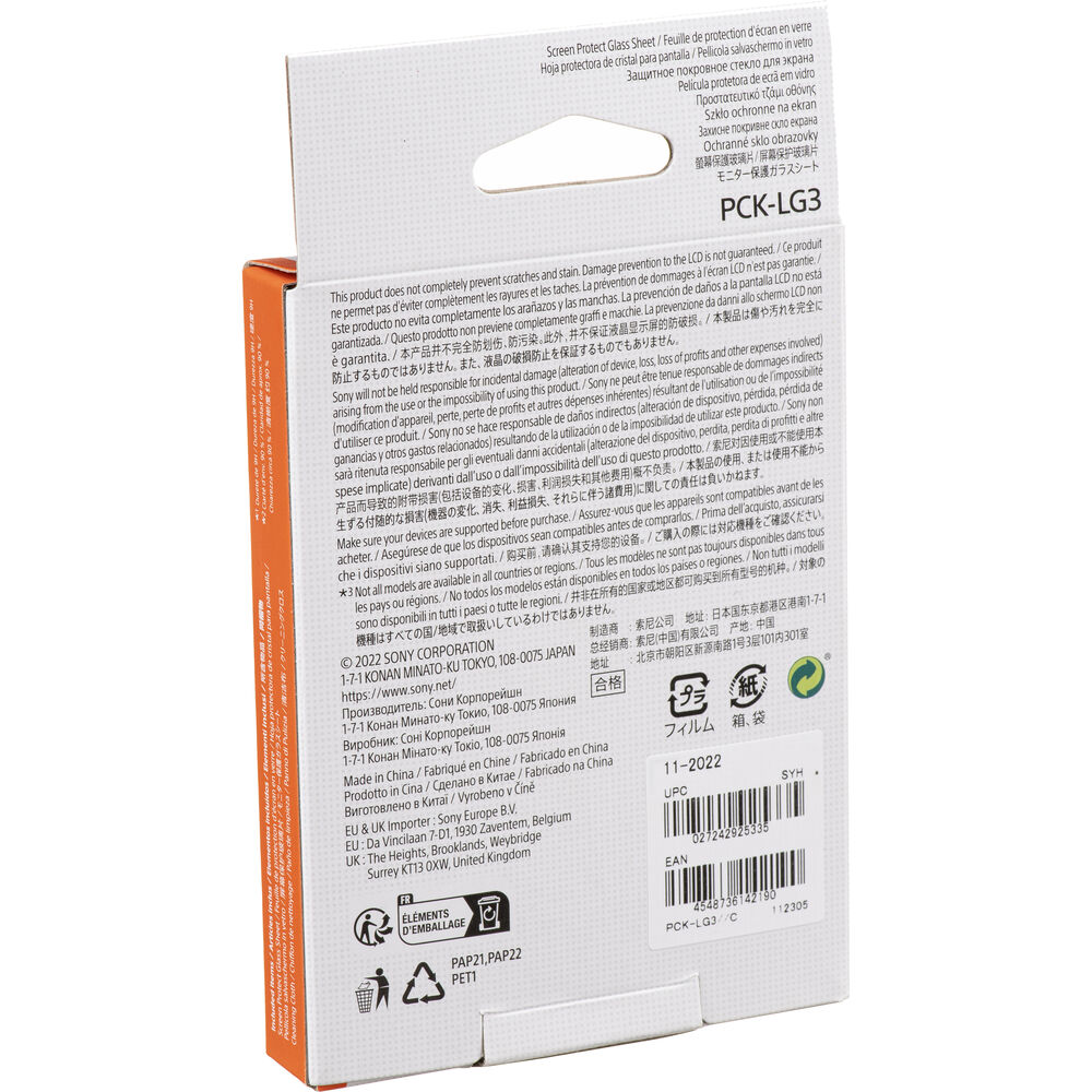 The Sony PCK-LG3 Glass Screen Protector for a7R V protects a camera's rear LCD from scratches or marks when in use. It is constructed from 9H-rated hard, shatterproof glass and has an anti-stain coating to resist marks or fingerprints. Additionally, it maintains full support for cameras' touchscreen and tilting functions.