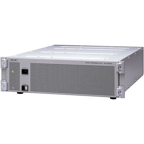 The PFV-SP3300 Signal Processing Frame (3RU & 17-Slot) from Sony is a signal processing frame that accommodates up to (17) HKSP/HKPF-SP Series function boards with a redundant power supply. When this unit is used in conjunction with a HKSP-300 processing module, the PFV-SP Series processing boards can be managed via a LAN 100Base-T Ethernet network.