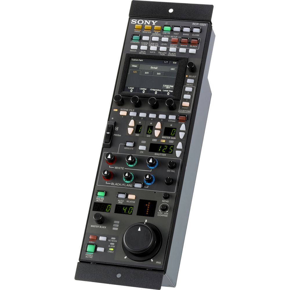 The Sony RCP-1501 Standard Remote Control Panel provides multifunctional operation of professional studio camcorders, using a dial knob-type control for iris and master black adjustments. A touch-panel LCD display provides direct access to numerous control functions, while allowing the customization of frequently used settings and menus. At just over 4" wide, the RCP-1501 is compact enough that up to 4 units can be mounted in a single 19" rack.
