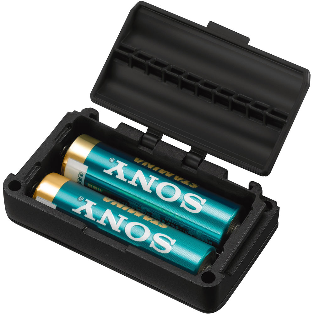 Two AA batteries (alkaline or NiMH rechargeable type) power the receiver for up to 6 hours.