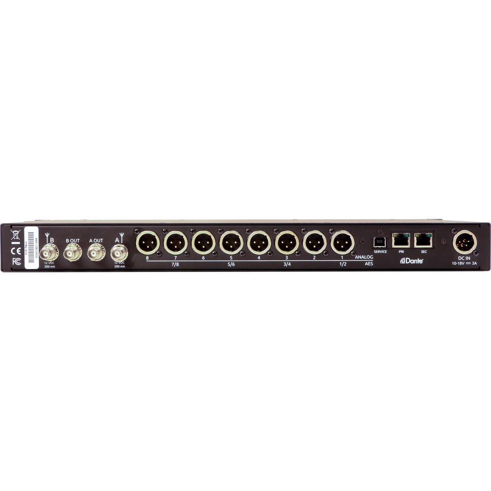 | Audio Outputs | 8 x 3-pin XLR-M analog and/or AES 2 x RJ45, to provide Dante primary and secondary |