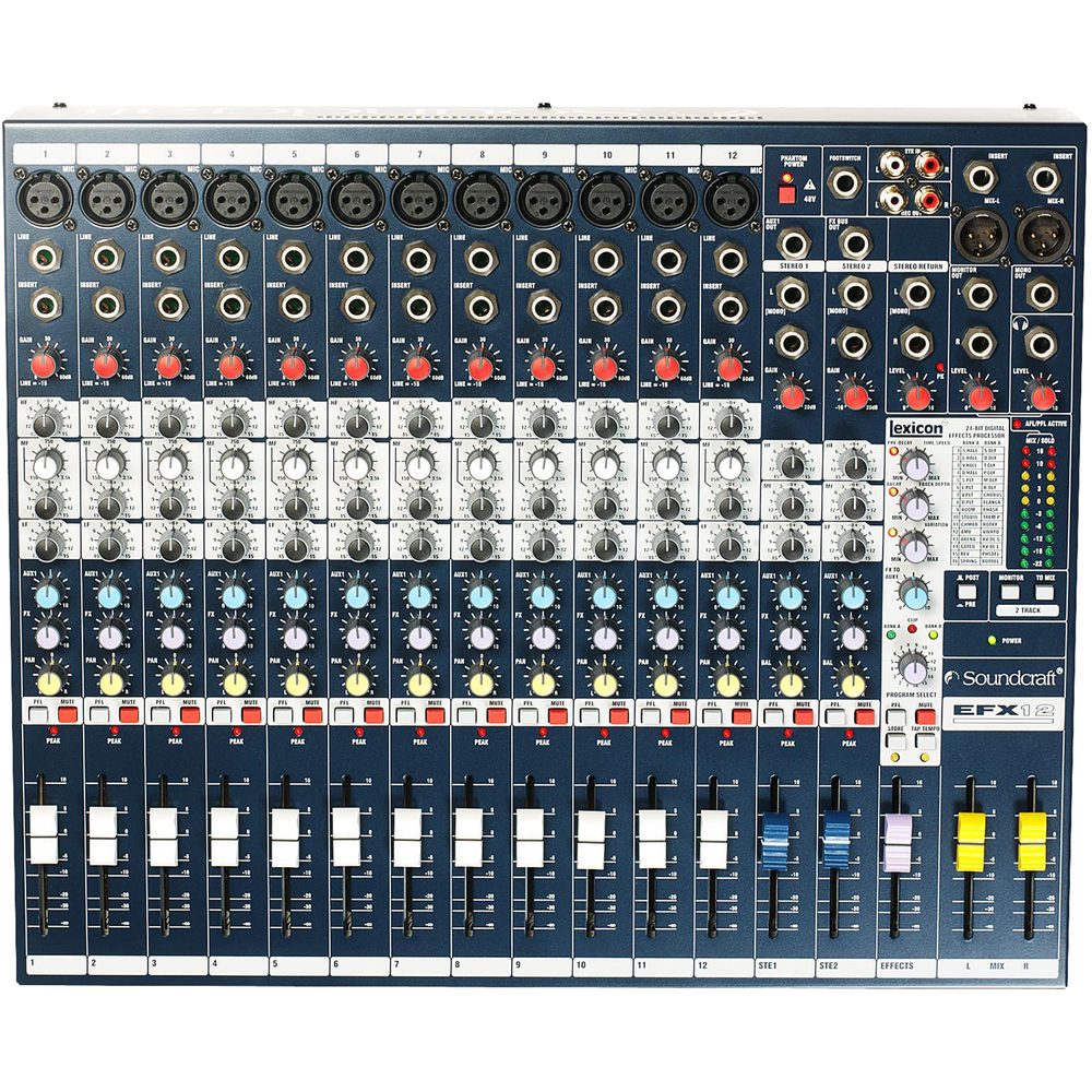 The Soundcraft EFX uses the highly transparent GB30 Mic amp designed by Graham Blythe. The Soundcraft EFX offers a configurable aux send, XLR and 1/4" metal jack connector sockets, RCA phono inputs and outputs, 3-band EQ, inserts, ten-segment LED output metering and a headphone output. The Effects section fits neatly into the mixers compact framework with an effects send on each channel. There are 32 effects to choose from with a tap tempo function, 3 effects parameter controls and a user effects setting store facility. An effects channel level clip LED and Mute function gives the user even more flexibility.