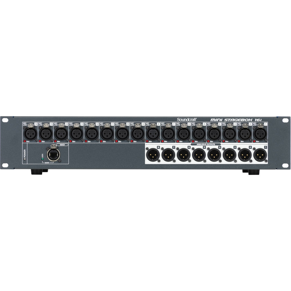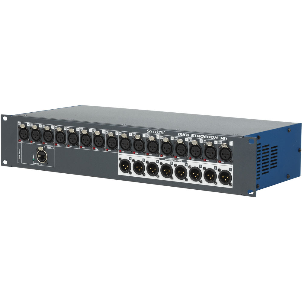 The Mini Stagebox 16i from Soundcraft offers multiple channels of remote controlled I/O for Si Series products—including the Si Impact mixing console—and is well suited for live sound engineers, houses of worship, bands, clubs, and corporate events. The Mini Stagebox requires only 2 RU of rack space, yet provides 16 recallable, high-quality, Studer-designed microphone preamp inputs, and 8 balanced line outputs, all remotely controlled from the console.
