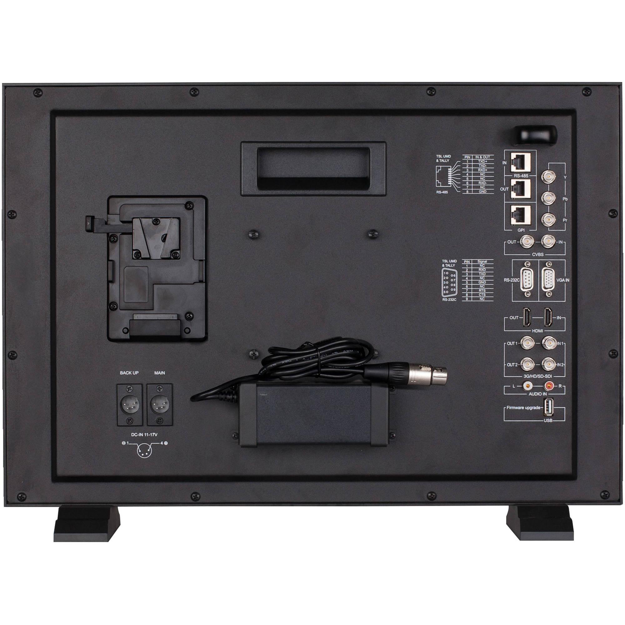 The monitor provides a standard USB port for firmware upgrade. You can download the latest firmware file to a USB stick, and directly insert it into the monitor to upgrade; no computer needed. For power, it provides a 4-pin XLR jack for 11-17 VDC, and a V-Mount battery plate enables outdoor using. There are three colors for the Tally light: Red, Green and Yellow.