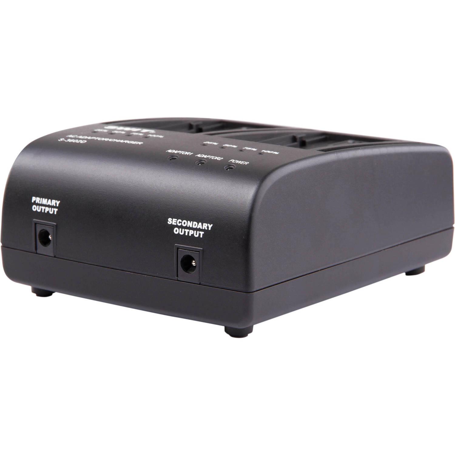 The SWIT S-3602D Dual Charger/Adapter has two charging channels with 7-8.4 VDC, 2A output each for simultaneously charging two batteries. It is compatible with the SWIT S-8D58/S-8D62 and Panasonic VW-VBD58 and CGA series D54 and D28 DV batteries. Four-level LED charging indicators for each channel indicate the percentage of charge remaining.
