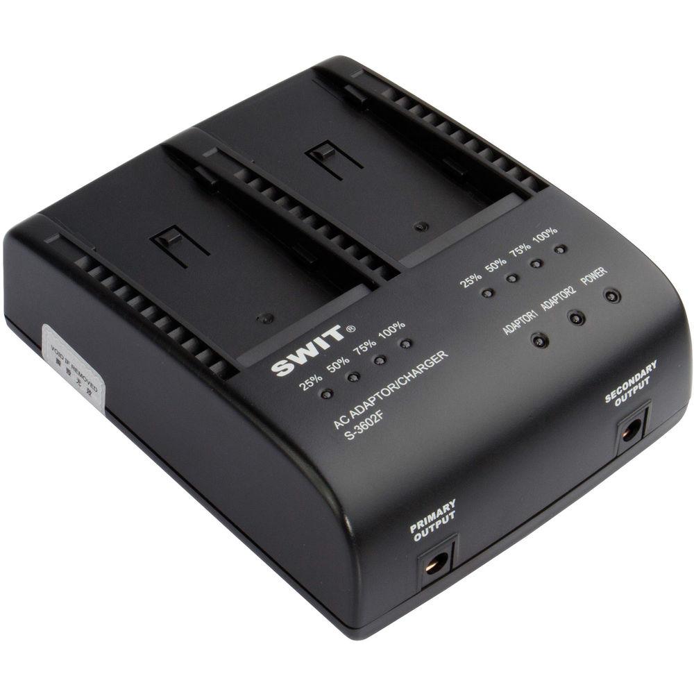 The SWIT S-3602F Dual Charger/Adapter has two charging channels with 7-8.4 VDC, 2A output each for simultaneously charging two batteries. It is compatible with the SWIT S-8972/S-8970 and Sony L-series batteries. Four-level LED charging indicators for each channel indicate the percentage of charge remaining.
