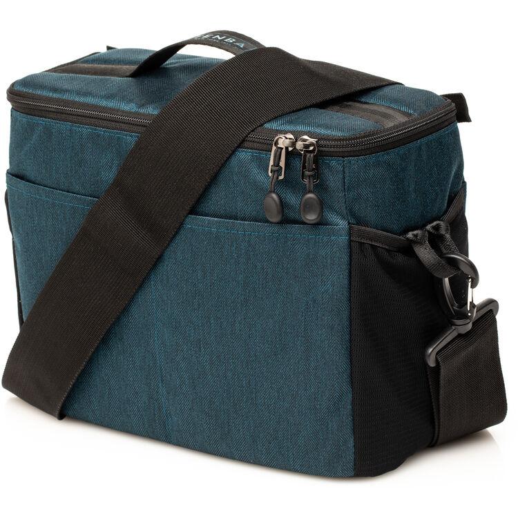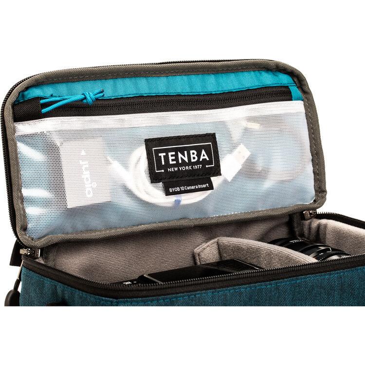 The blue BYOB 10 Camera Insert from Tenba is designed to carry and protect a camera and gear inside other non-camera bags including larger backpacks, suitcases, or handbags. Its soft outer shell molds to the shape of many different types of bags. The BYOB 10 will hold a DSLR or mirrorless camera body with up to 4 lenses and accessories including an attached 24-70mm f/2.8. Padded interior dividers are adjustable to fit multiple configurations and the soft-brushed tricot-lined interior will not scratch your equipment. The insert features a zippered top cover that can be folded back and stowed to allow easy access to your gear plus a handle for carrying and quick removal of the insert. Stretch mesh pockets provide a place to store your phone, camera and lens accessories, or other items. The zippered interior pockets secure smaller more valuable items. In addition there are front and rear pockets for acessories and a D-ring to attach keys, a carabiner, or a tethered media walle