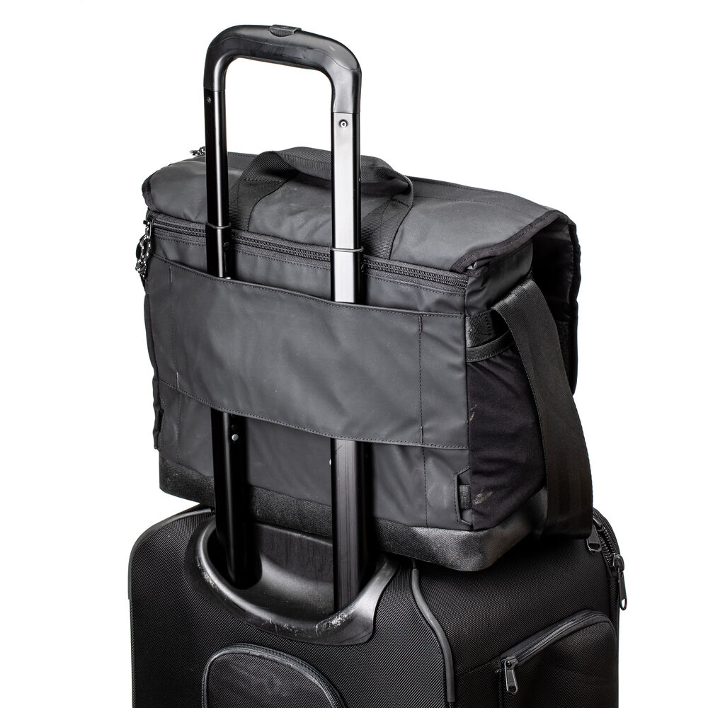 - Rear trolley strap slides over the extending handle of rolling luggage or equipment case for secure piggyback travel