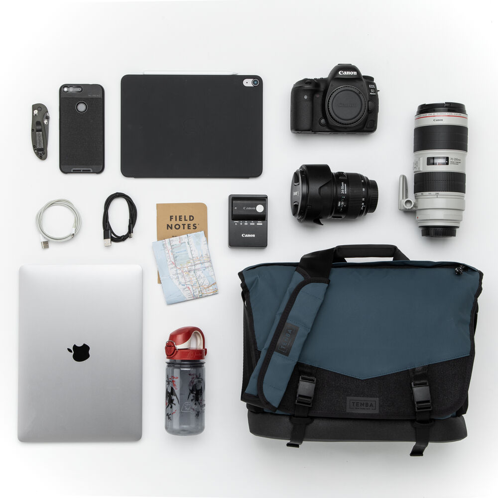 Built for seamless transitions between photojournalism and sports photography, urban exploration and adventure travel, and all kinds of social events with or without a camera, the blue Tenba DNA 13 DSLR Camera Messenger Bag can hold a camera with a 70-200mm 2.8 lens attached, three to five additional lenses, a flash, accessories, personal gear, a laptop, and a tablet. The camera and lenses fit inside a padded insert in the main compartment that can be removed to allow its use as a conventional bag. Thoughtful design features and proprietary hardware make this bag easy to use and durable against the elements.