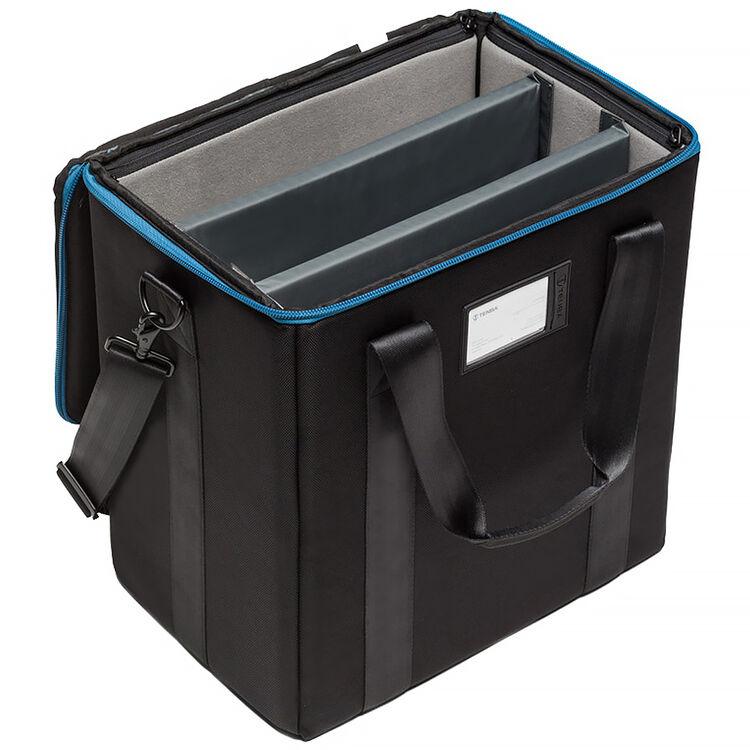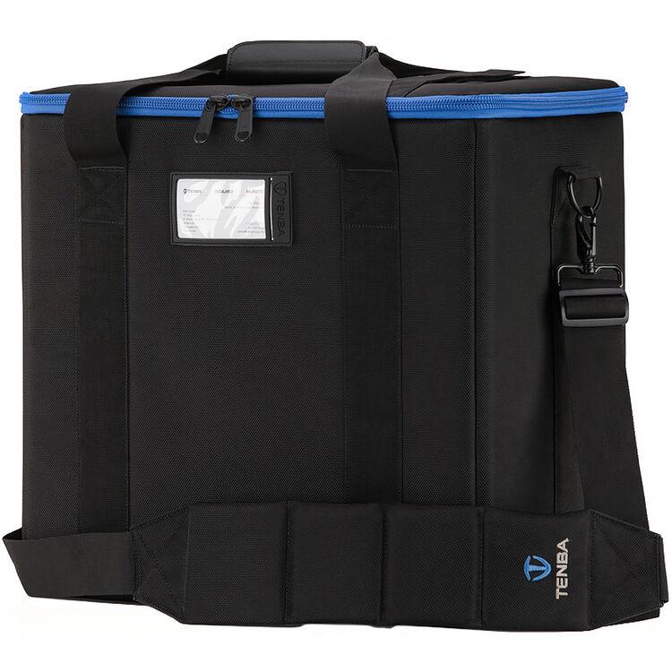 This black Tenba Transport 1x1 LED 2-Panel Case is designed to carry, ship and protect two 1x1 LED panels with or without barndoors, as well as cables and gel filters. The exterior of the case is made of water-repellent 1680 denier ballistic nylon with self-healing YKK zippered closure. Steel D-rings secure the included padded strap while adjustable straps on top of the case hold light stands or similar gear. Two straps are also sewn onto the back of the case that are meant to slip over a hand truck or rolling case and enable piggybacking if desired. Hand straps that can be joined with a touch-fastener are also part of the case construction.