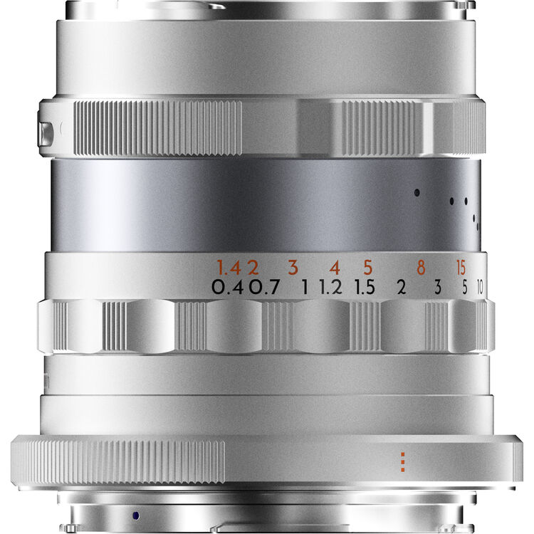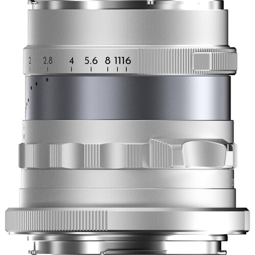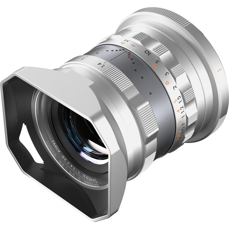 Designed in homage to the legendary Kern Macro-Switar lens for Alpa 35mm cameras, the silver Canon RF-mount Thypoch Simera 28mm f/1.4 Lens puts its bright, low-light friendly optics into a sleek aluminum housing for high-quality imagery in a wide range of shooting scenarios. Its large aperture also enhances depth of field effects like bokeh and subject-background separation. Featuring a declickable aperture ring and a grooved focus tab, the lens' manual focus design is both tactile and wieldy. The optical design features an extra-low dispersion element, two high-refractive index elements, and an aspherical element for clarity from the center to edge of the frame.