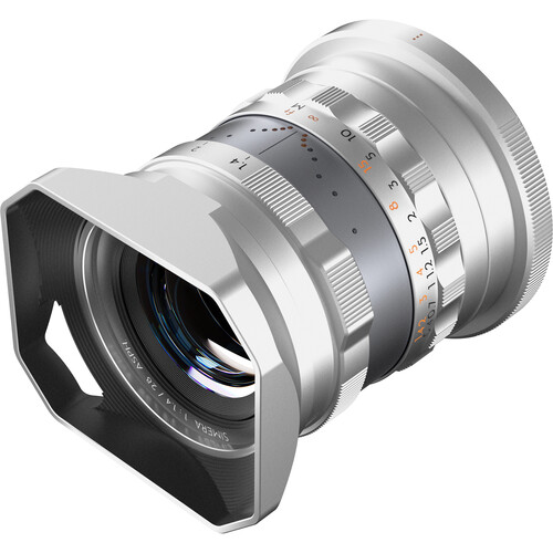 Designed in homage to the legendary Kern Macro-Switar lens for Alpa 35mm cameras, the silver Nikon Z-mount Thypoch Simera 28mm f/1.4 Lens puts its bright, low-light friendly optics into a sleek aluminum housing for high-quality imagery in a wide range of shooting scenarios. Its large aperture also enhances depth of field effects like bokeh and subject-background separation. Featuring a declickable aperture ring and a grooved focus tab, the lens' manual focus design is both tactile and wieldy. The optical design features an extra-low dispersion element, two high-refractive index elements, and an aspherical element for clarity from the center to edge of the frame.