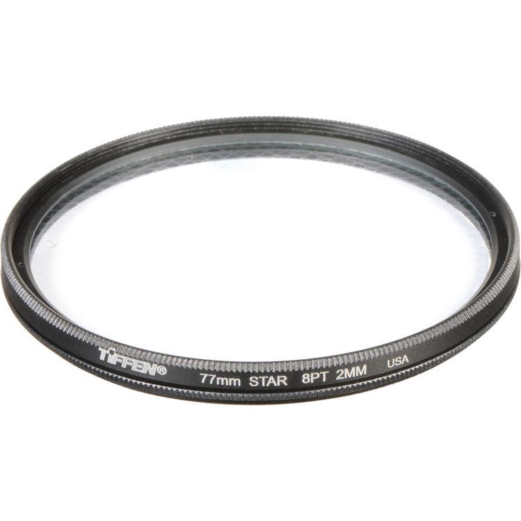 The 77mm 8pt/2mm Star Filter from Tiffen creates multiple points of light, or "stars," streaking outward from a central light source. This filter comes in a rotating mount for critical placement of the star effect.