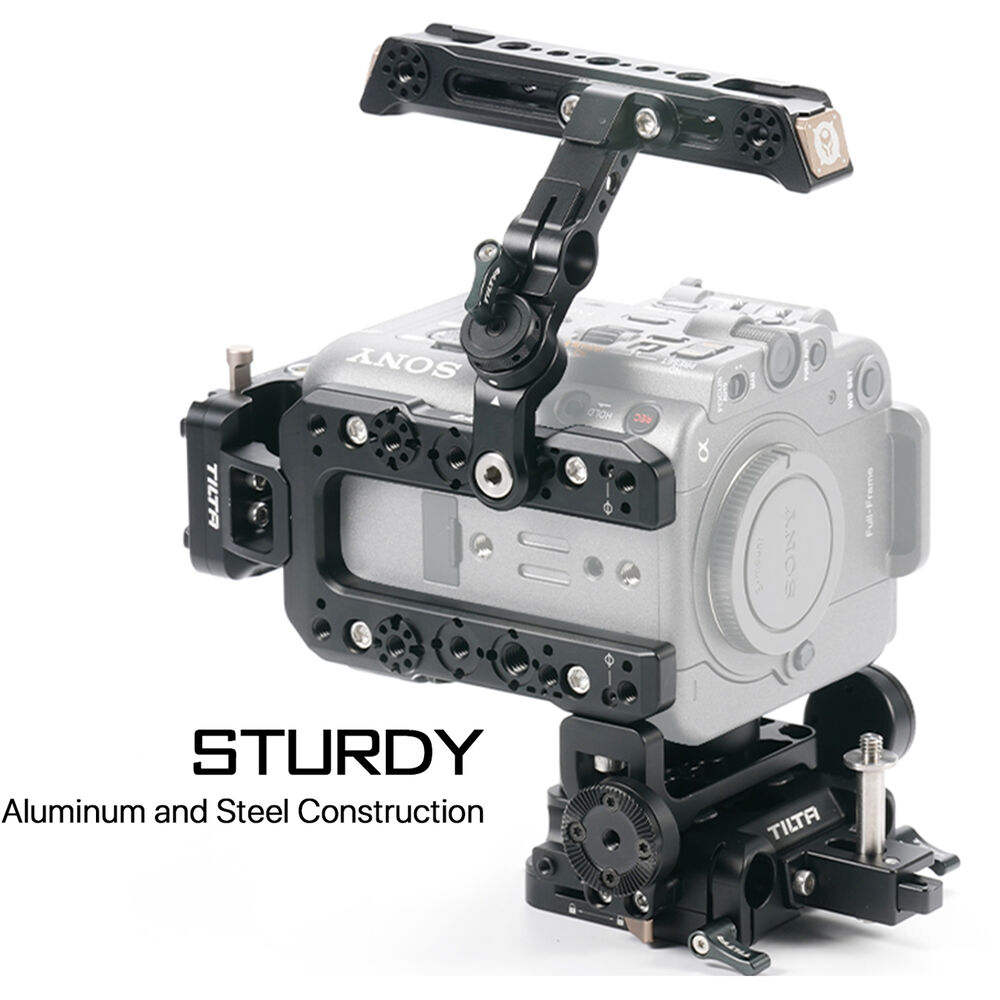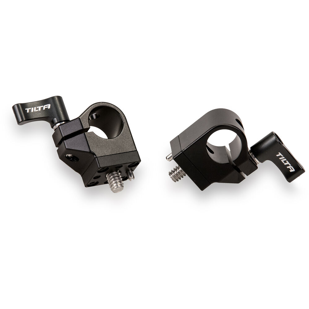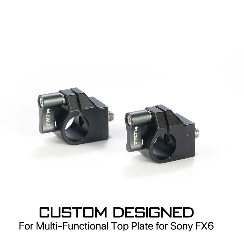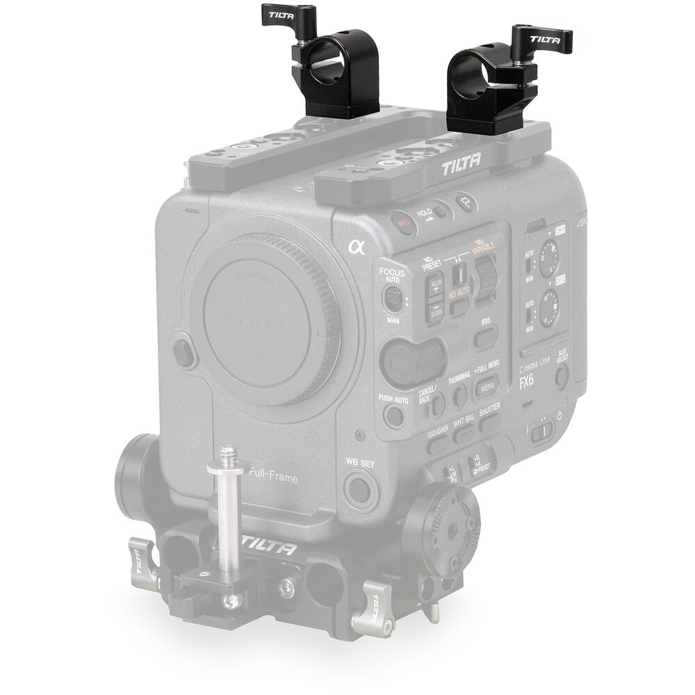 This pair of 15mm Single-Rod Clamps for Sony FX6 camera from Tilta allows you to mount 15mm support rods (not included) on the top of your Sony FX6 camera, allowing you to add a variety of rod-mounted accessories. The rod clamps attach to your camera using the 1/4"-20 threaded holes on top of your camera and feature locating pins that prevent the rod clamps from spinning once mounted.
