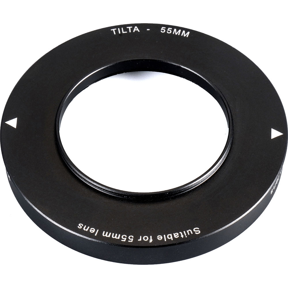 This Tilta 55mm Adapter Ring allows you to mount the Tilta Mini Clamp-On Matte Box on lenses that have a 55mm front diameter. The adapter ring screws onto the front of the lens, and the matte box then clamps onto the adapter ring. The thumbscrew on the side of the matte box is used to secure the matte box firmly to the adapter ring. The adapter ring also provides a thread for attaching 55mm screw-on filters to the lens. This is done right before mounting the matte box. After attaching the adapter ring to the lens, screw on the filter to the provided thread, and then attach the matte box. The adapter ring is made of aluminum and comes in black.