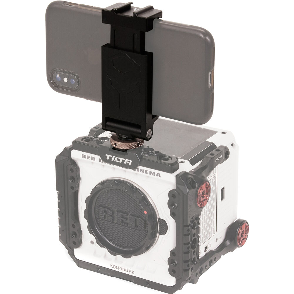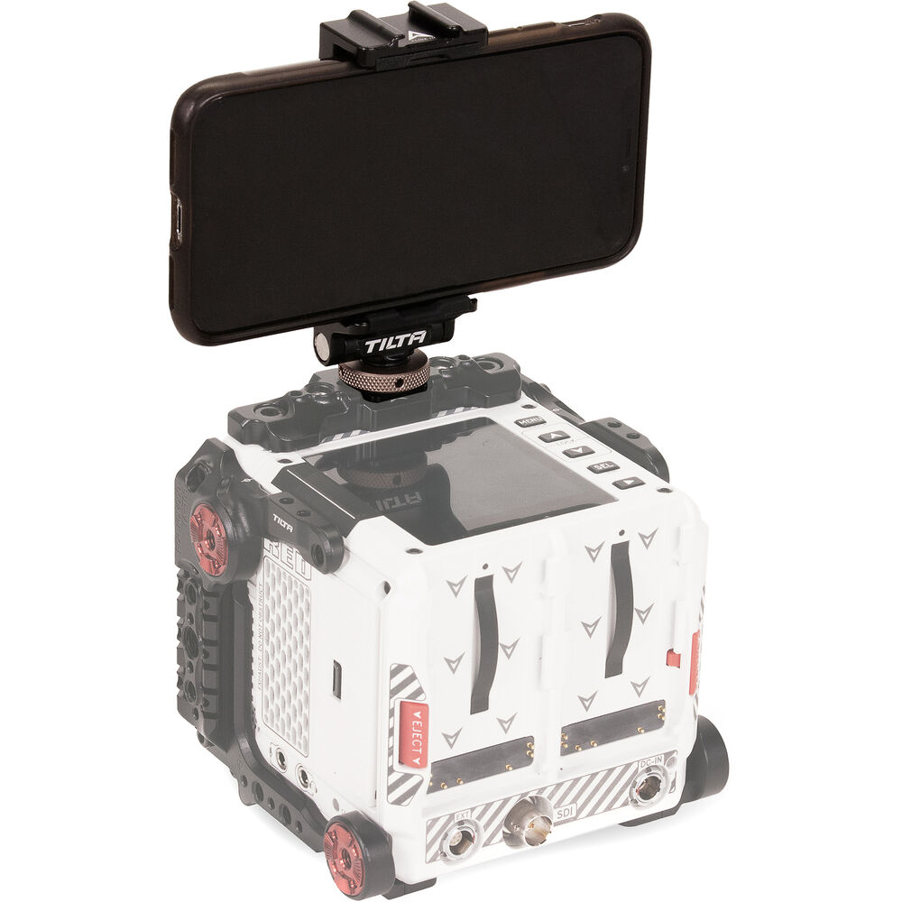 Tilta's Adjustable Cold Shoe Phone Mounting Bracket, in black, allows you to attach your smartphone directly to your camera hot shoe or a camera cage shoe mount. It's height-adjustable to support smartphones up to 3.6", and it provides tension-based tilt adjustment to let you set your phone to the desired angle on the fly without having to tighten any knobs. It also offers a shoe mount on top for attaching additional accessories, such as an LED light or microphone. The cold shoe on the bottom is secured tool-free via a built-in thumbwheel, letting you efficiently attach and remove the bracket. The inside wall of the phone holder is rubber-padded, to safely support your phone without scratching.