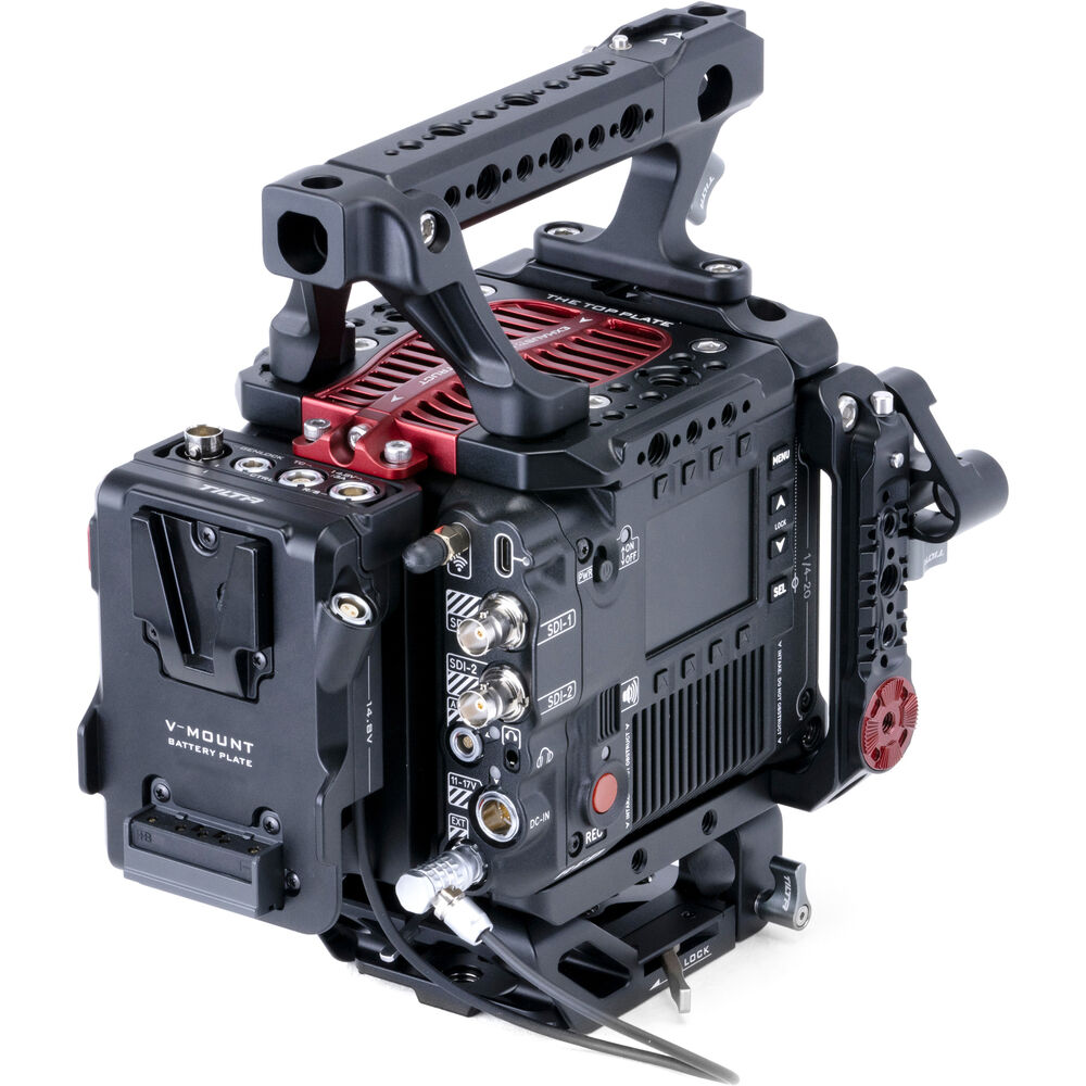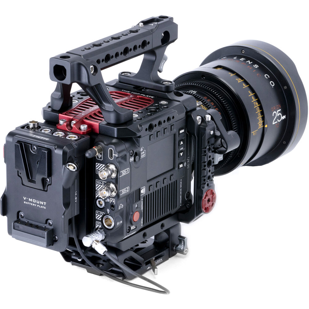 The Tilta Advanced Camera Cage Kit expands on the configuration of the Basic Kit and takes your handheld RED V-RAPTOR configuration to the next level with its included V-mount battery plate. Your connection capabilities are further increased with an advanced I/O module that adds more ports to your camera for things like timecode, genlock, and power.