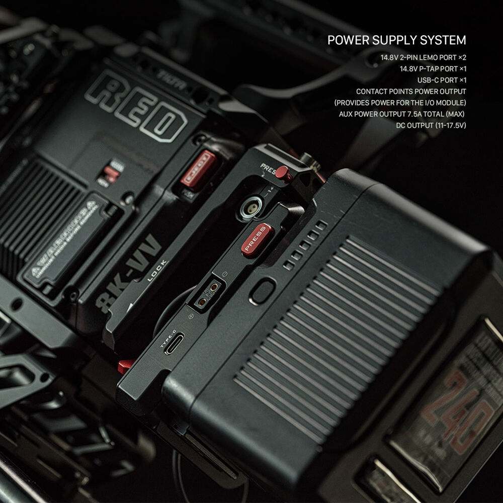 The module can be mounted to various locations on the separately available RED V-RAPTOR full camera cage for intuitive integration. It can be powered via the 14.8V 2-pin LEMO input.
