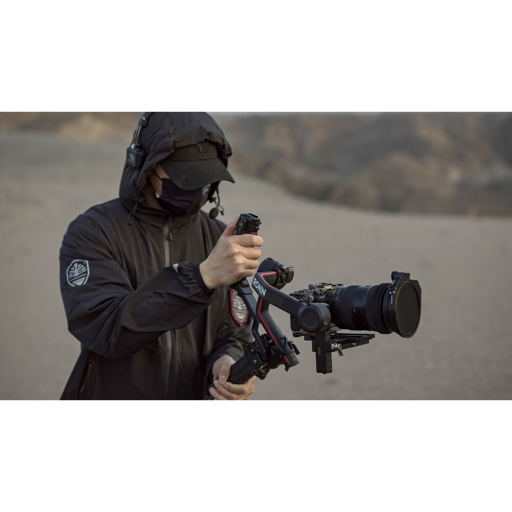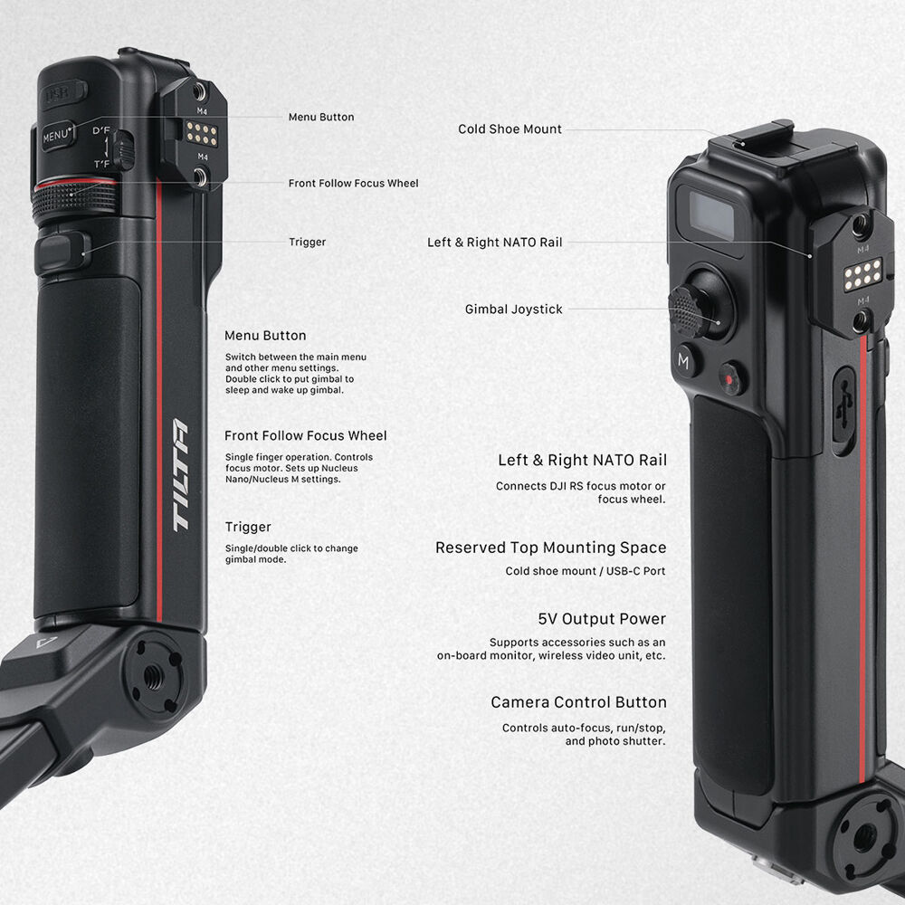 The handle draws power from the gimbal battery, and it features a USB-C power output to power an optional accessory that can be mounted onto the handle using its top shoe mount or its side 1/4"-20 anti-twist threads. Its plug-and-play design also features built-in gimbal and camera control buttons, a joystick, a focus wheel, and a trigger that allow you to control both gimbal and camera settings.