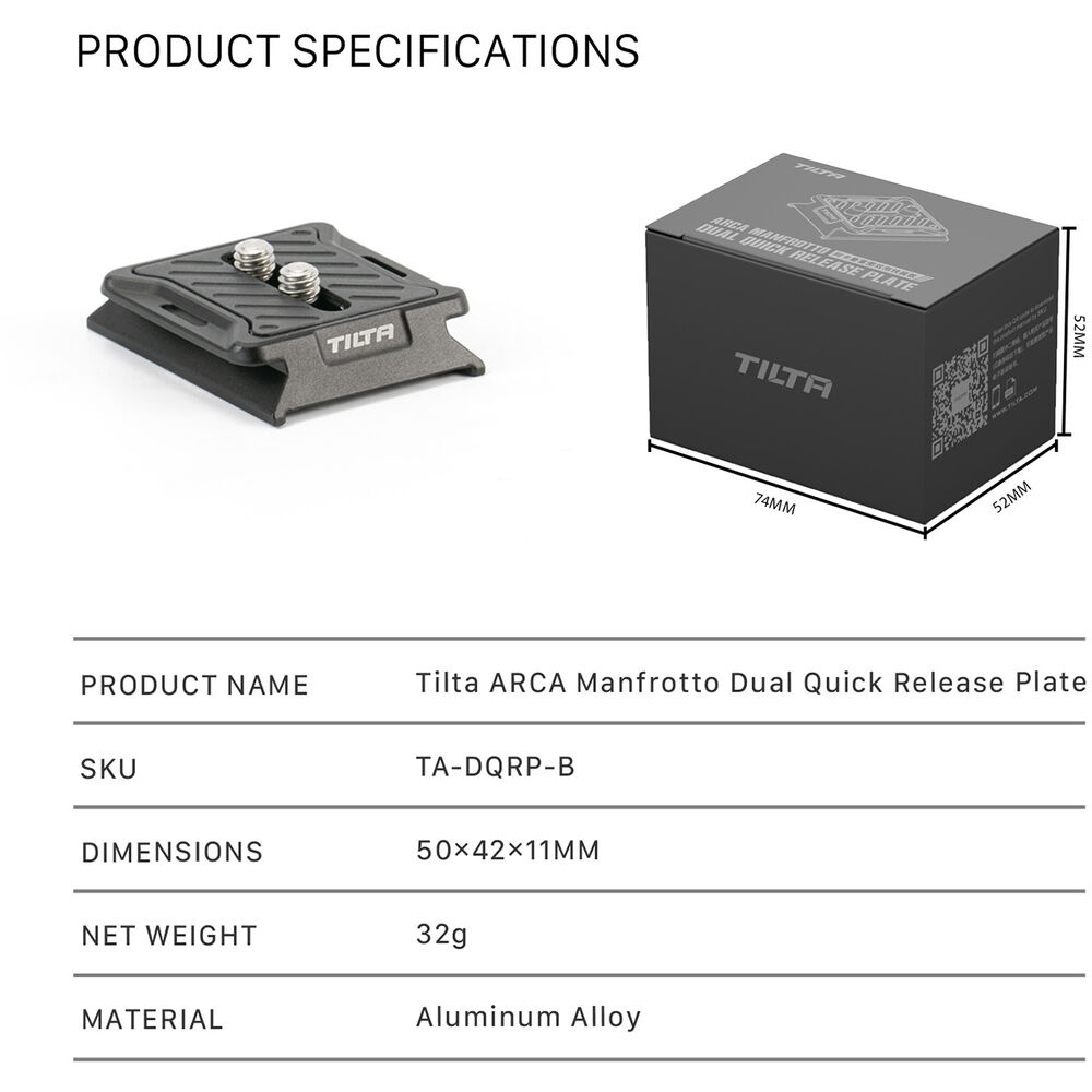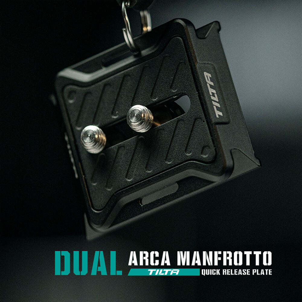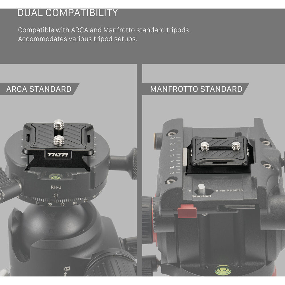 This Dual Quick Release Plate from Tilta enables both Arca-type and Manfrotto connection types, making it a flexible option for filmmakers who commonly use both of these support systems. This plate utilizes two 1/4"-20 screws and features a pop-out thumbscrew design to provide a secure connection and limit camera rotation.