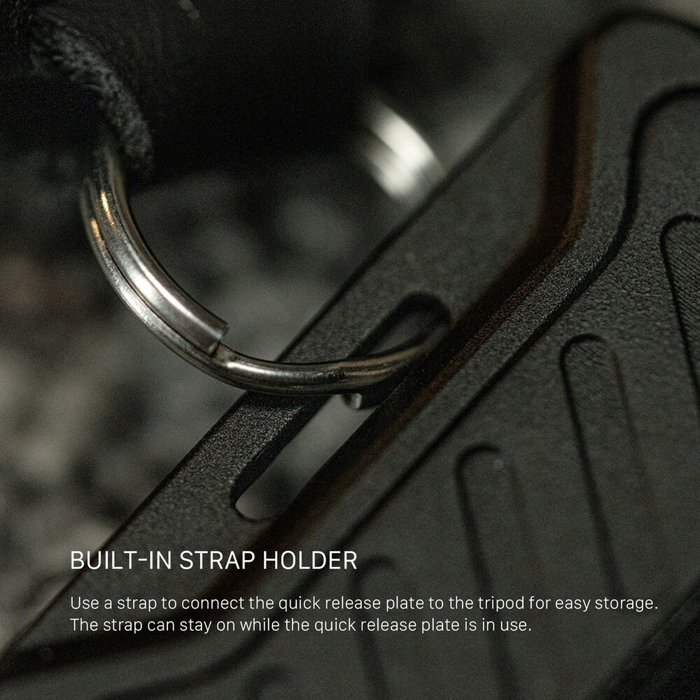 This quick release plate also features an integrated strap holder that allows you to connect a small strap (not included) to the plate to secure it to your tripod or support system when not connected to a camera. Please note this plate is based on DJI's Arca Standard and may not be compatible with all Arca or Manfrotto receivers.