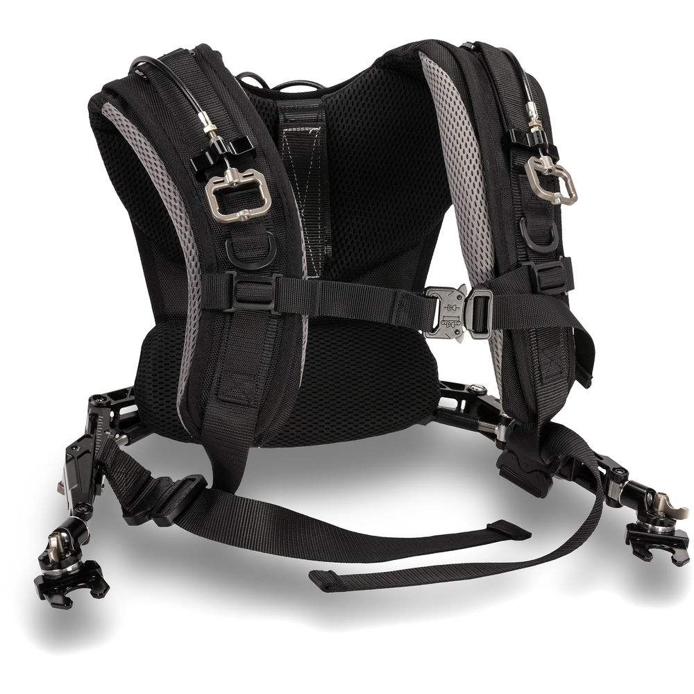 The Tilta Armor Man 3.0 Support Vest is the main part of the Armor Man 3.0 system. All the other parts, including the mechanical arms, attach to this vest. The vest has release cables that hang in front of it. These cables let you release the tension of the mechanical arms when the arms are in the locked position. The vest is padded for comfort, and it features adjustable straps for securing it to most body types.