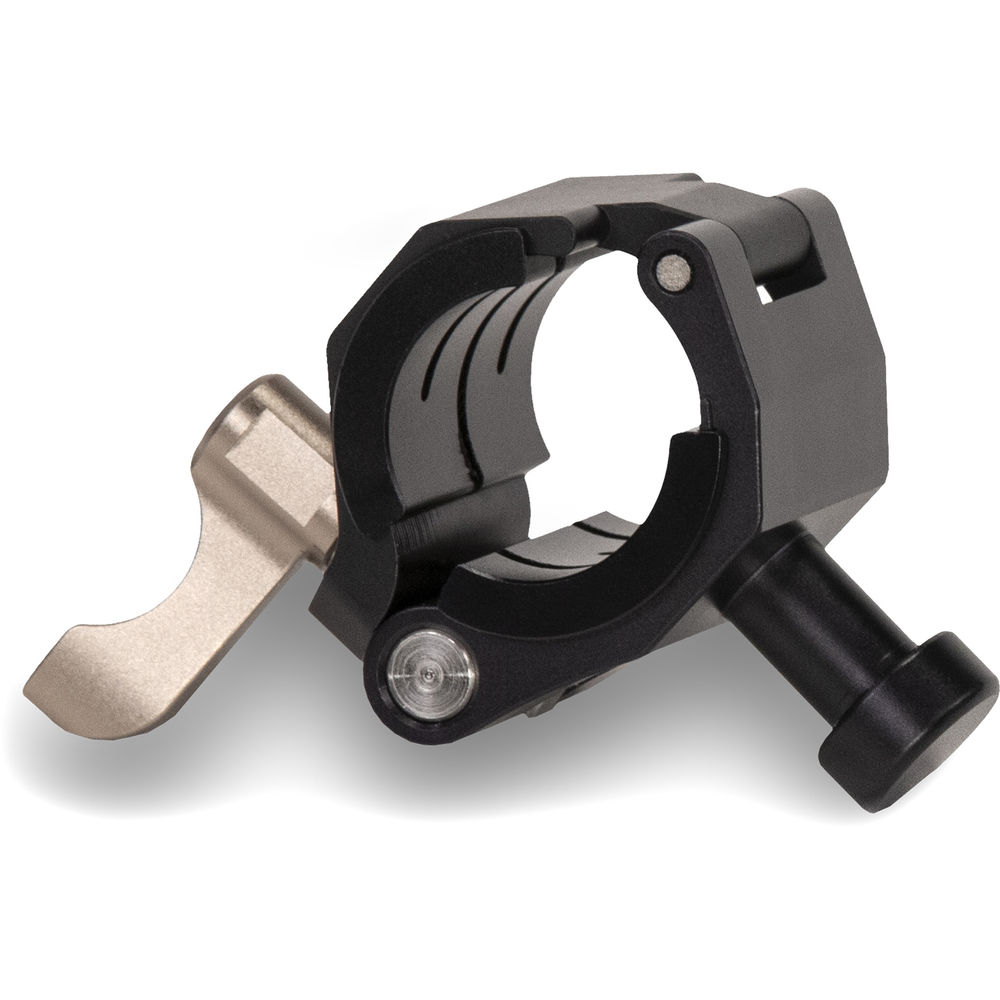 The Tilta Armor Man 3.0 Universal Gimbal Ring Adapter Clamps attach to a ring-based gimbal in order to connect to the Armor Man arms by quick release. They're for use in standard operating mode (as opposed to overhead mode). Included are two clamps that attach to the top corners of the gimbal ring. Also required for this workflow are the Armor Man 3.0 Universal Gimbal Ring Adapters. The adapters attach to the arms, and the clamps connect to the adapters by quick release.