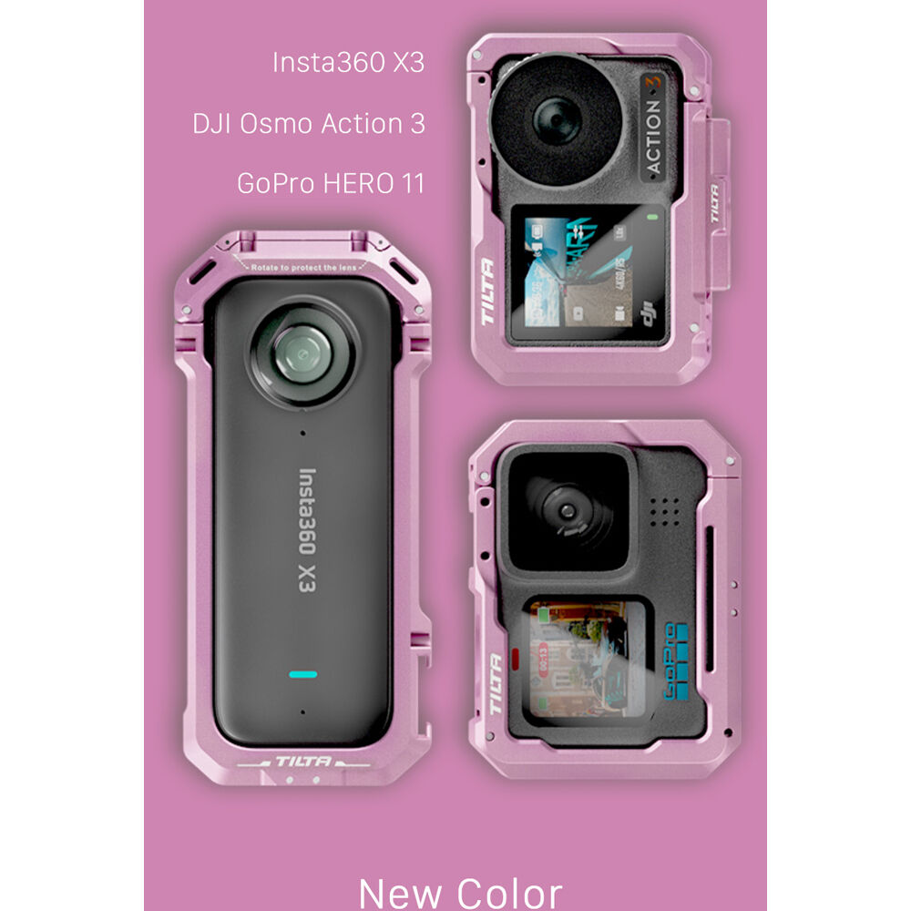 The pink Basic Camera Cage Kit from Tilta offers 360° protection for your Osmo Action 3 camera while maintaining access to all ports and controls. The kit includes a formfitting full camera cage and a magnetic mounting baseplate.