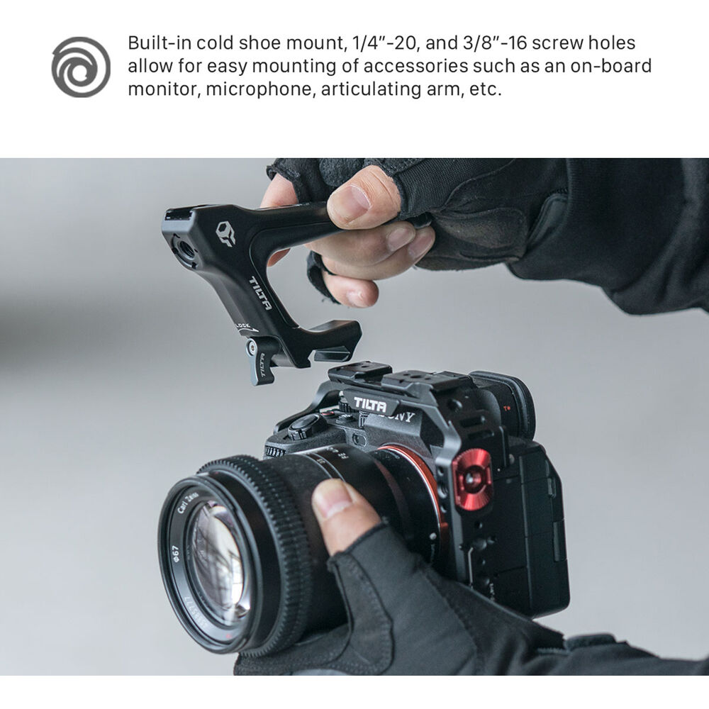 Carry and stabilize your Tiltaing camera cage with this black Tiltaing Compact NATO Top Handle from Tilta. This compact quick release top handle is smaller than the standard Tiltaing quick release handle and well suited for use with smaller cameras or when a smaller shooting package is desired. There is one shoe mount on top and multiple 1/4"-20 and 3/8"-16 threads, and they each feature anti-twist divots.