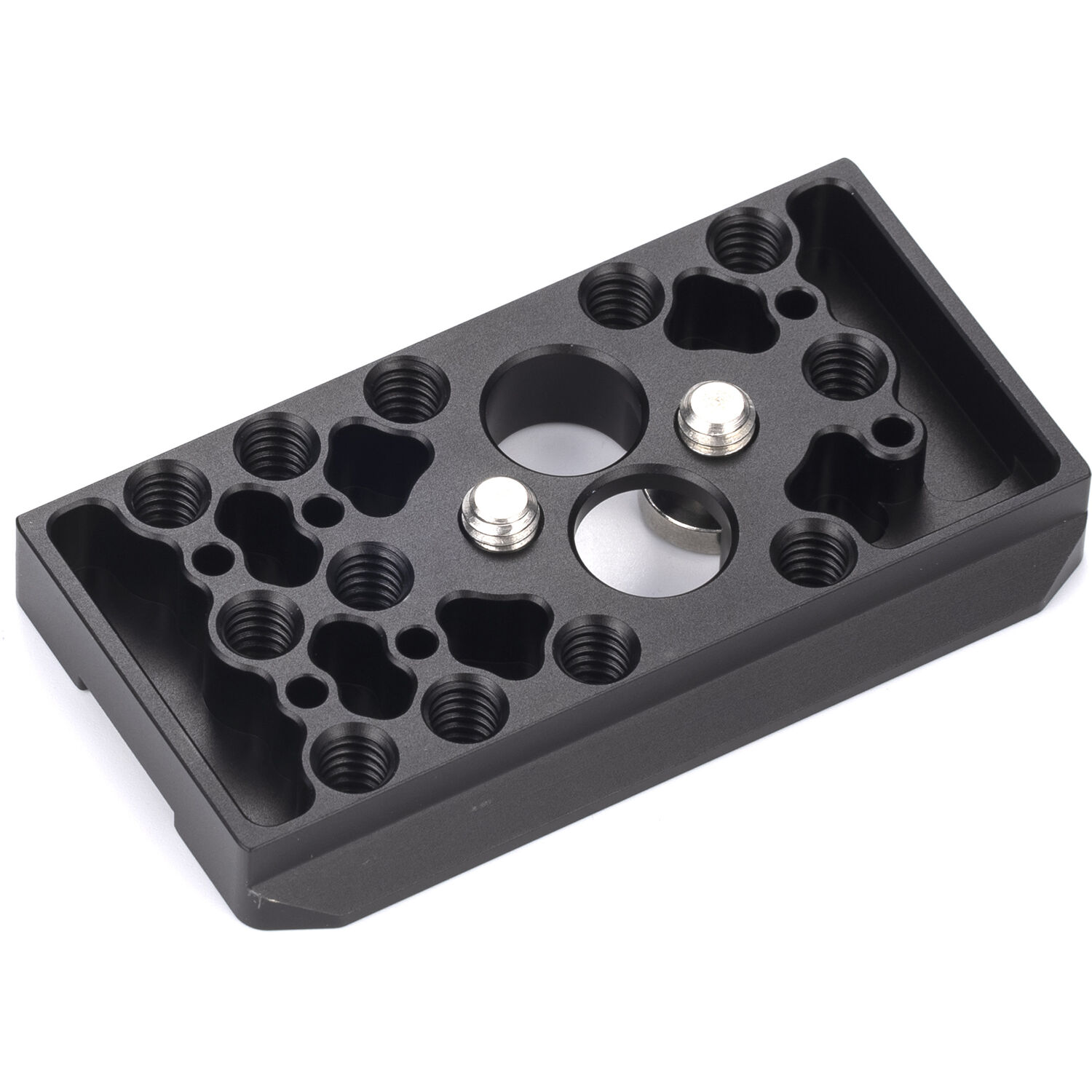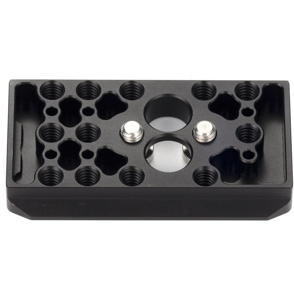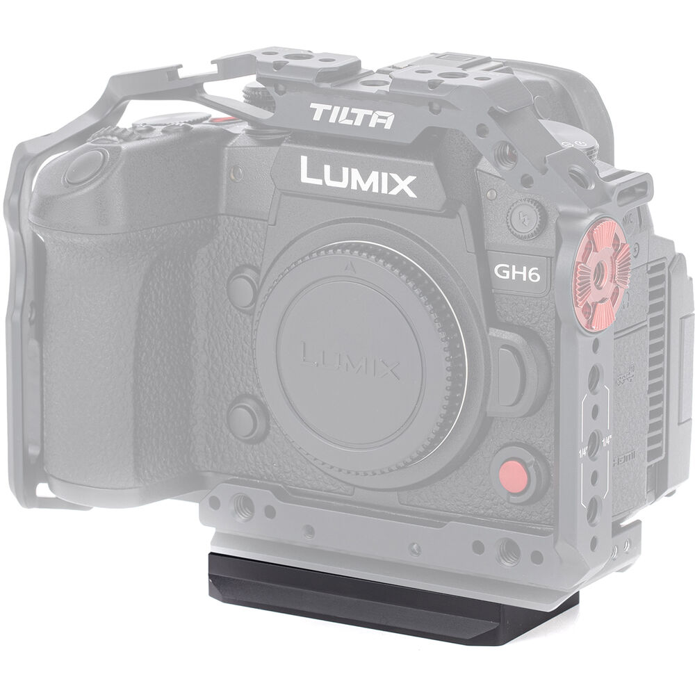 Secure your full camera cage kit to your quick release system with the black Bottom Plate for Panasonic GH6. This bottom plate is designed to attach to the 1/4"-20 threading at the base of the cage while still leaving plenty of room to tighten or loosen the screws that are inserted into the base of the camera and hold it in place.