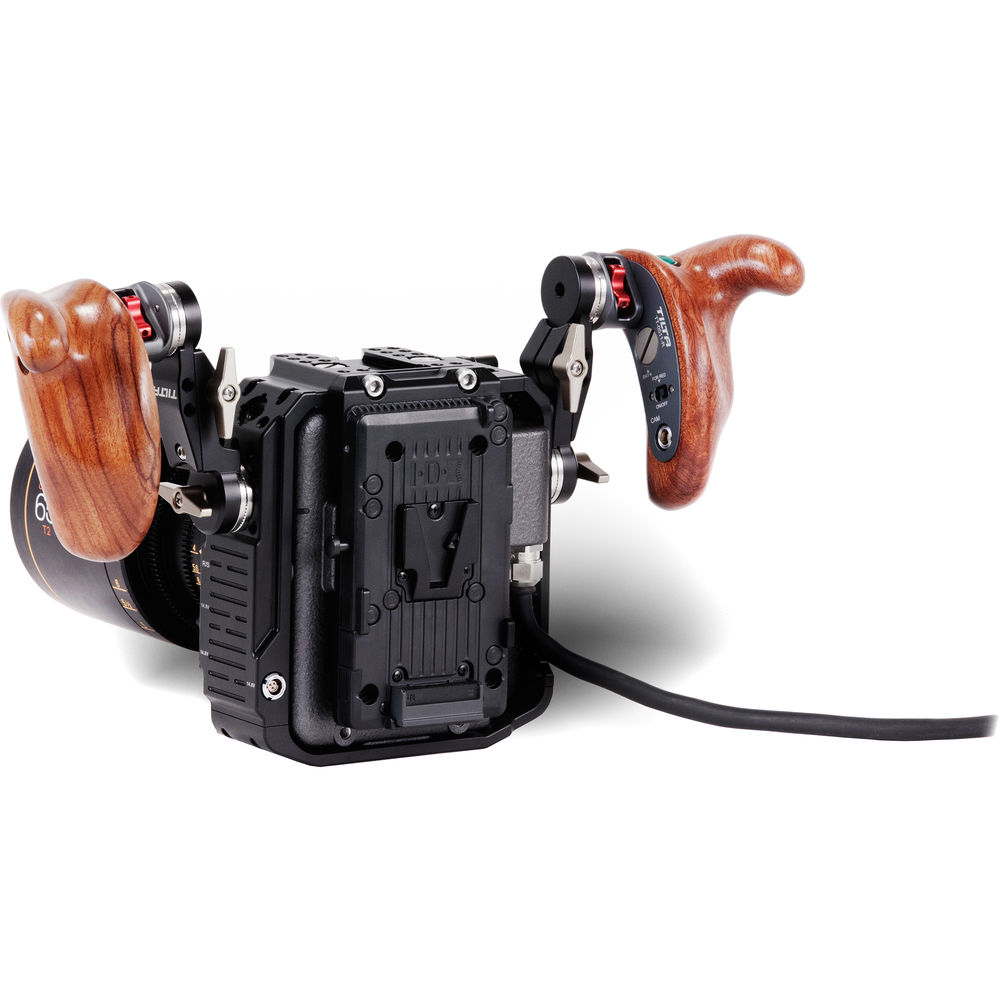 This protective Cage for Sony VENICE Rialto Extension from Tilta features four power/communication ports and comes with a V-mount battery plate that secures on the rear. It also includes two run/stop cables and wooden control handgrips with extension arms that attach to integrated rosette mounts.